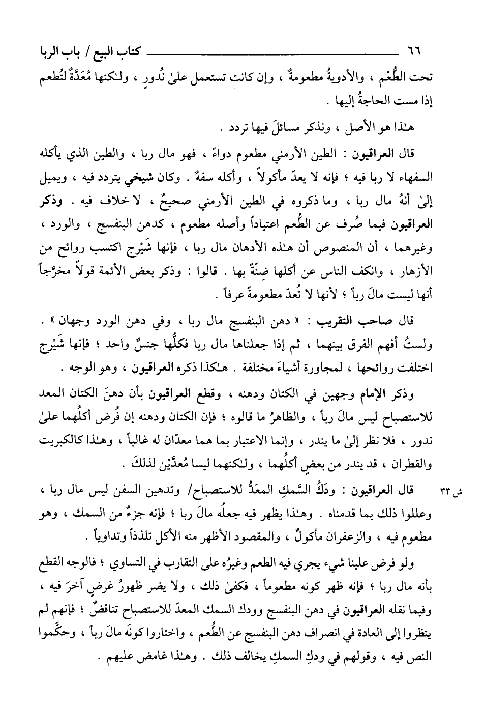قال العراقيون: الطين الأرمني مطعوم دواءً، فهو مال ربا، والطين الذي يأكله السفهاء لا ربا فيه؛ فإنه لا يعدّ مأكولاً، وأكله سفهٌ. وكان شيخي يتردد فيه، ويميل إلى أنهُ مال ربا، وما ذكروه في الطين الأرمني صحيحٌ، لا خلاف فيه. وذكر العراقيون فيما صُرف عن الطُّعم اعتياداً وأصله مطعوم، كدهن البنفسج، والورد، وغيرهما، أن المنصوص أن هذه الأدهان مال ربا، فإنها شَيْرج اكتسب روائح من الأزهار، وانكف الناس عن أكلها ضِنّة بها. قالوا: وذكر بعض الأئمة قولاً مخرَّجاً أنها ليست مالَ رباً؛ لأنها لا تُعدّ مطعومةً عرفاً.