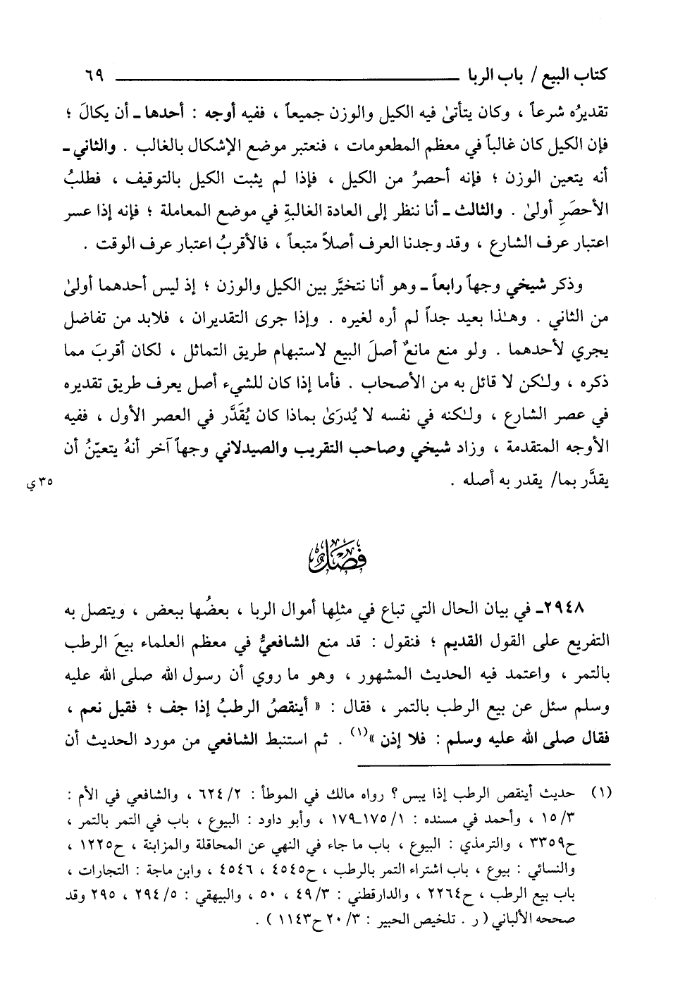 (1) حديث أينقص الرطب إذا يبس؟ رواه مالك في الموطأ: 2/ 624، والشافعي في الأم: 3/ 15، وأحمد في مسنده: 1/ 175 - 179، وأبو داود: البيوع، باب في التمر بالتمر، ح 3359، والترمذي: البيوع، باب ما جاء في النهي عن المحاقلة والمزابنة، ح 1225، والنسائي: بيوع، باب اشتراء التمر بالرطب، ح 4545، 4546، وابن ماجة: التجارات، باب بيع الرطب، ح 2264، والدارقطني: 3/ 49، 50، والبيهقي: 5/ 294، 295 وقد صححه الألباني (ر. تلخيص الحبير: 3/ 20 ح 1143).