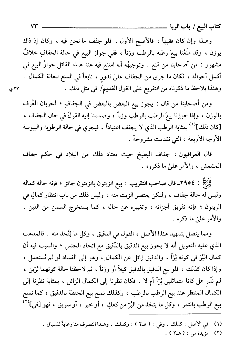 2954 - قال صاحب التقريب: بيع الزيتون بالزيتون جائز؛ فإنه حالة كماله وليس له حالة جفاف، ولكن يعتصر الزيت منه، وليس ذلك من باب انتظار كمالٍ في الزيتون؛ فإنه تفريق أجزائه، وتغييره عن حاله، كما يستخرج السمن من اللبن.