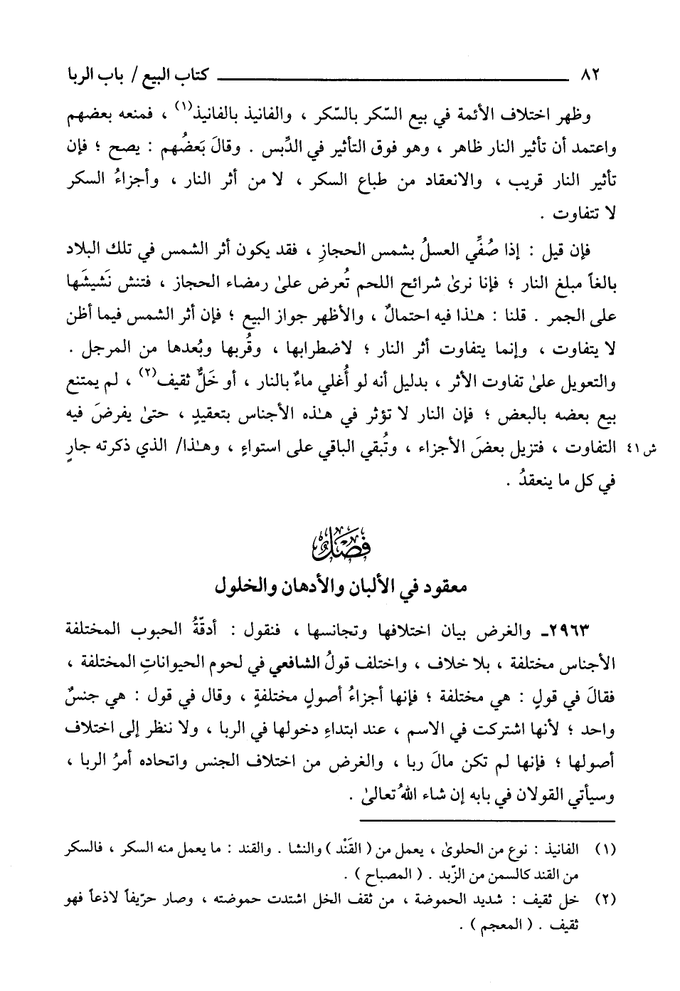 وظهر اختلاف الأئمة في بيع السكر بالسّكر، والفانيذ بالفانيذ (1)، فمنعه بعضهم واعتمد أن تأثير النار ظاهر، وهو فوق التأثير في الدِّبس. وقالَ بَعضُهم: يصح؛ فإن تأثير النار قريب، والانعقاد من طباع السكر، لا من أثر النار، وأجزاءُ السكر لا تتفاوت.