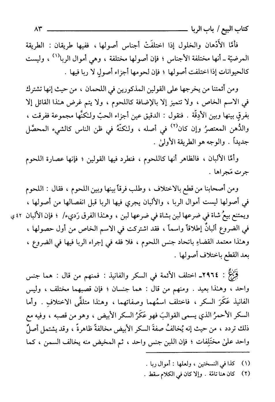 2964 - اختلف الأئمة في السكر والفانيذ: فمنهم من قال: هما جنس واحد، وهذا بعيد. ومنهم من قال: هما جنسان؛ فإن قصبهما مختلف، وليس الفانيذ عَكَرَ السكر، فاختلف اسمُهما وصفاتهما، وهذا متلقَّى الاختلافِ. وأما السكر الأحمرُ الذي يسمى القوالبَ فهو عَكَرُ السكر الأبيض، وهو من قصبه، وفيه مع ذلك تردد، من حيث إنه يُخالفُ صفةَ السكر الأبيض مخالفةً ظاهرةً، وقد يشتمل أصلٌ واحد على مختَلِفات؛ فإن اللبن جنس واحد، ثم المخيض منه يخالف السمن، كما