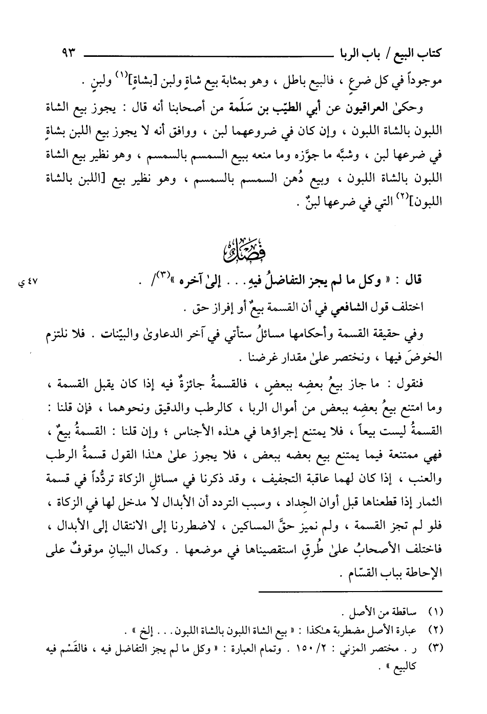 (3) ر. مختصر المزني: 2/ 150. وتمام العبارة: " وكل ما لم يجز التفاضل فيه، فالقَسْم فيه كالبيع ".
