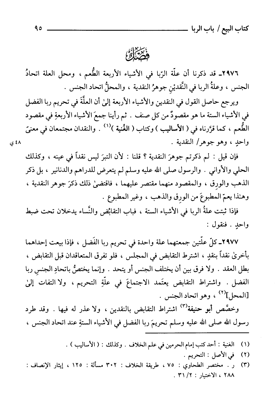 2976 - قد ذكرنا أن علّة الرّبا في الأشياء الأربعة الطُّعم، ومحل العلة اتحادُ الجنس، وعلةُ الربا في النَّقديْنِ جوهرُ النقدية، والمحل اتحاد الجنس.