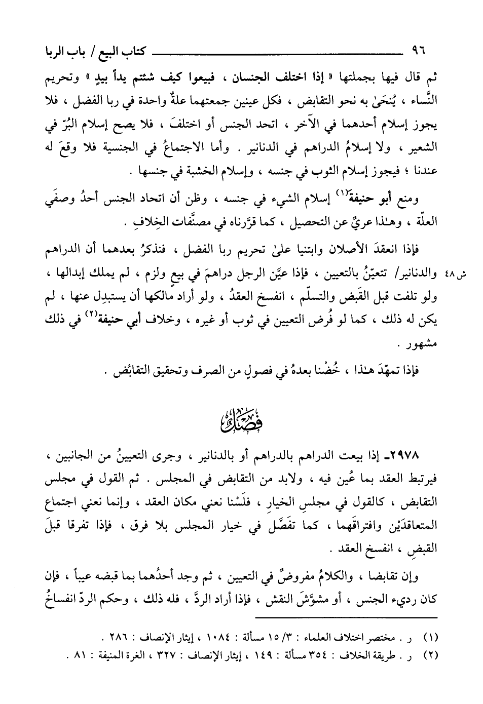 فإذا انعقدَ الأصلان وابتنيا على تحريم ربا الفضل، فنذكرُ بعدهما أن الدراهم والدنانير تتعيّنُ بالتعيين، فإذا عيَّن الرجل دراهمَ في بيعٍ ولزم، لم يملك إبدالها، ولو تلفت قبل القَبض والتسلم، انفسخ العقدُ، ولو أراد مالكها أن يستبدِل عنها، لم يكن له ذلك، كما لو فُرض التعيين في ثوب أو غيره، وخلاف أبي حنيفة (2) في ذلك مشهور.
