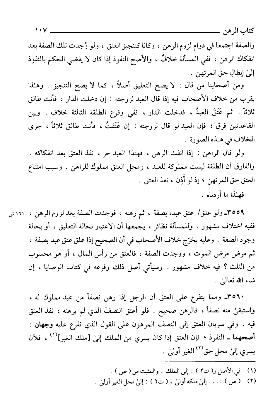 3559 - ولو علق عتق عبده بصفة، ثم رهنه، فوجدت الصفة بعد لزوم الرهن، ففيه اختلاف مشهور. وللمسألة نظائر، يجمعها أن الاعتبار بحالة التعليق، أو بحالة وجود الصفة. وعليه يخرّج خلاف الأصحاب في أن الصحيح إذا علق عتق عبد بصفة، ثم مرض مرض الموت، ووجدت الصفة، فالعتق من رأس المال، أو هو محسوب من الثلث؟ فيه خلاف مشهور. وسيأتي أصل ذلك وفرعه في كتاب الوصايا، إن شاء الله تعالى.