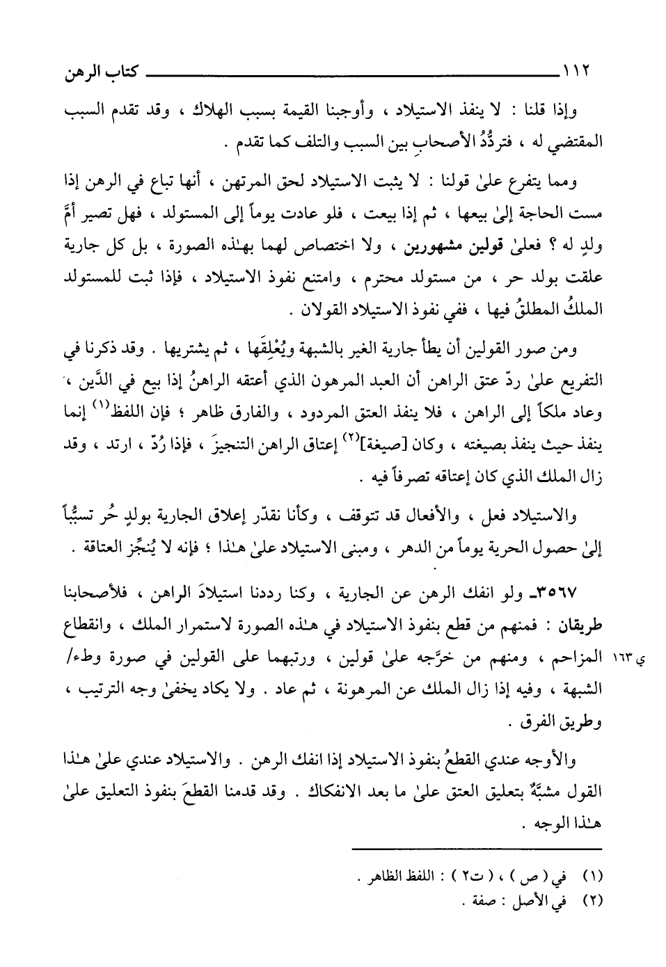 3567 - ولو انفك الرهن عن الجارية، وكنا رددنا استيلادَ الراهن، فلأصحابنا طريقان: فمنهم من قطع بنفوذ الاستيلاد في هذه الصورة لاستمرار الملك، وانقطاع المزاحم، ومنهم من خرَّجه على قولين، ورتبهما على القولين في صورة وطء الشبهة، وفيه إذا زال الملك عن المرهونة، ثم عاد. ولا يكاد يخفى وجه الترتيب، وطريق الفرق.