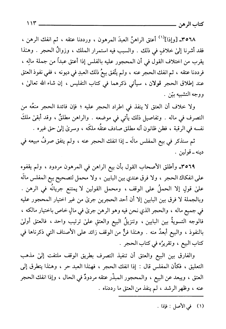 3569 - وأطلق الأصحاب القول بأن بيع الراهن في المرهون مردود، ولم يقفوه على انفكاك الحجر، ولا فرق عندي بين البابين، ولا محمل لتصحيح بيع المفلس مالَه على قولٍ إلا الحملُ على الوقف، ومحمل القولين لا يمتنع جريانه في الرهن.