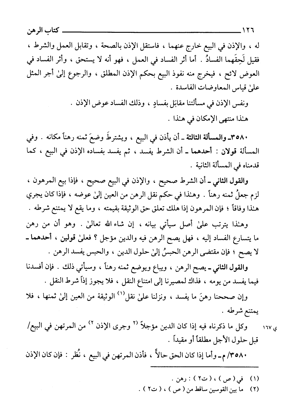 3580 - والمسألة الثالثة - أن يأذن في البيع، ويشترطَ وضعَ ثمنه رهناً مكانه. وفي المسألة قولان: أحدهما - أن الشرط يفسد، ثم يفسد بفساده الإذن في البيع، كما قدمناه في المسألة الثانية.