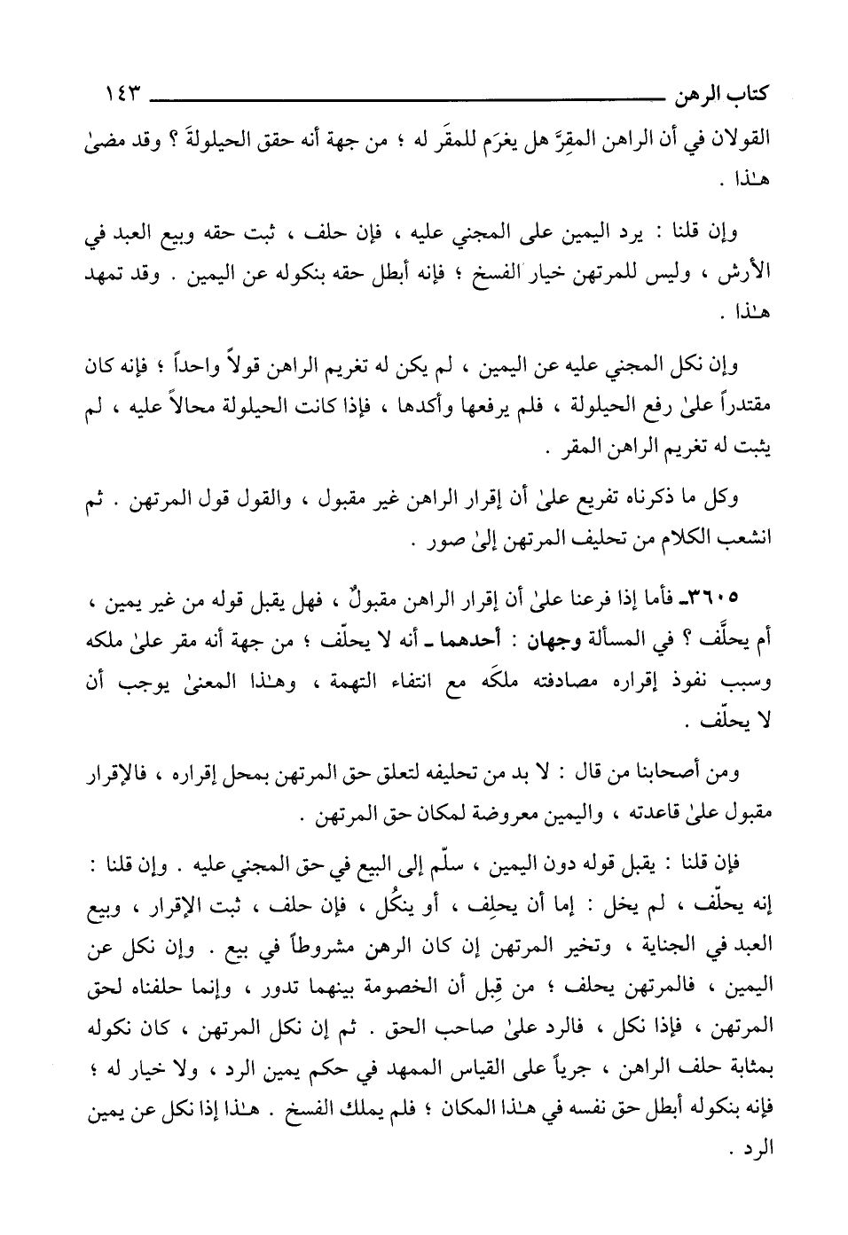 3605 - فأما إذا فرعنا على أن إقرار الراهن مقبول، فهل يقبل قوله من غير يمين، أم يحلَّف؟ في المسألة وجهان: أحدهما - أنه لا يحلّف؛ من جهة أنه مقر على ملكه وسبب نفوذ إقراره مصادفته ملكَه مع انتفاء التهمة، وهذا المعنى يوجب أن لا يحلّف.