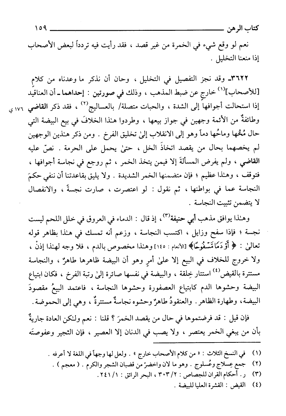 وهذا يوافق مذهب أبي حنيفة (3)، إذ قال: الدماء في العروق في خلل اللحم ليست نجسة؛ فإذا سفح وزايل، اكتسب النجاسة، وزعم أنه تمسك في هذا بظاهر قوله تعالى: {أَوْ دَمًا مَسْفُوحًا} [الأنعام: 145] وهذا مخصوص بالدم، فلا وجه لهذا إذنْ، ولا خروج للخلاف في البيع إلا على أمرٍ وهو أن البيضة ظاهرها طاهر، والنجاسة مستترة بالقيض (4) استتار خِلقة، والبيضة في نفسها صائرة إلى رتبة الفرخ، فكان ابتياع البيضة وحشوها الدم كابتياع العصفورة وحشوها النجاسة، فاعتمد البيعُ مقصودَ البيضة، وطهارة الظاهر. والعنقودُ طاهرٌ وحشوه نجاسة مستترةٌ، وهي إلى الحموضة.