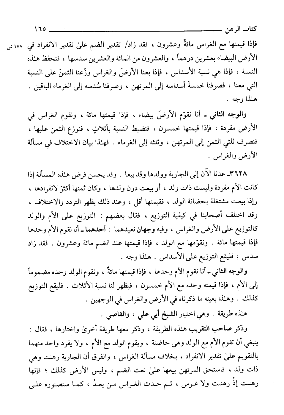 فإذا قيمتها مع الغراس مائة وعشرون، فقد زاد تقدير الضم على تقدير الانفراد في الأرض البيضاء بعشرين درهماً، والعشرون من المائة والعشرين سدسها، فنحفظ هذه النسبة، فإذا هي نسبة الأسداس، فإذا بعنا الأرضَ والغراس وزّعنا الثمنَ على النسبة التي معنا، فصرفنا خمسةَ أسداسه إلى المرتهن، وصرفنا سُدسه إلى الغرماء الباقين.