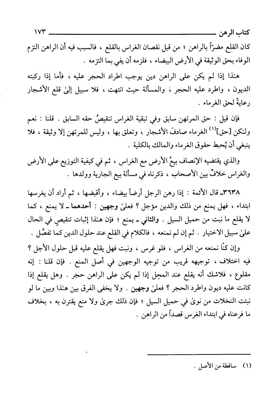 3638 - قال الأئمة: إذا رهن الرجل أرضاً بيضاء، وأقبضها، ثم أراد أن يغرسها ابتداء، فهل يمنع من ذلك والدين مؤجل؟ فعلى وجهين: أحدهما - لا يمنع، كما لا يقلع ما نبت من حميل السيل. والثاني - يمنع؛ فإن هذا إثبات تنقيصٍ في الحال على سبيل الاختيار. ثم إن لم نمنعه، فالكلام في القلع عند حلول الدين كما تفصَّل.