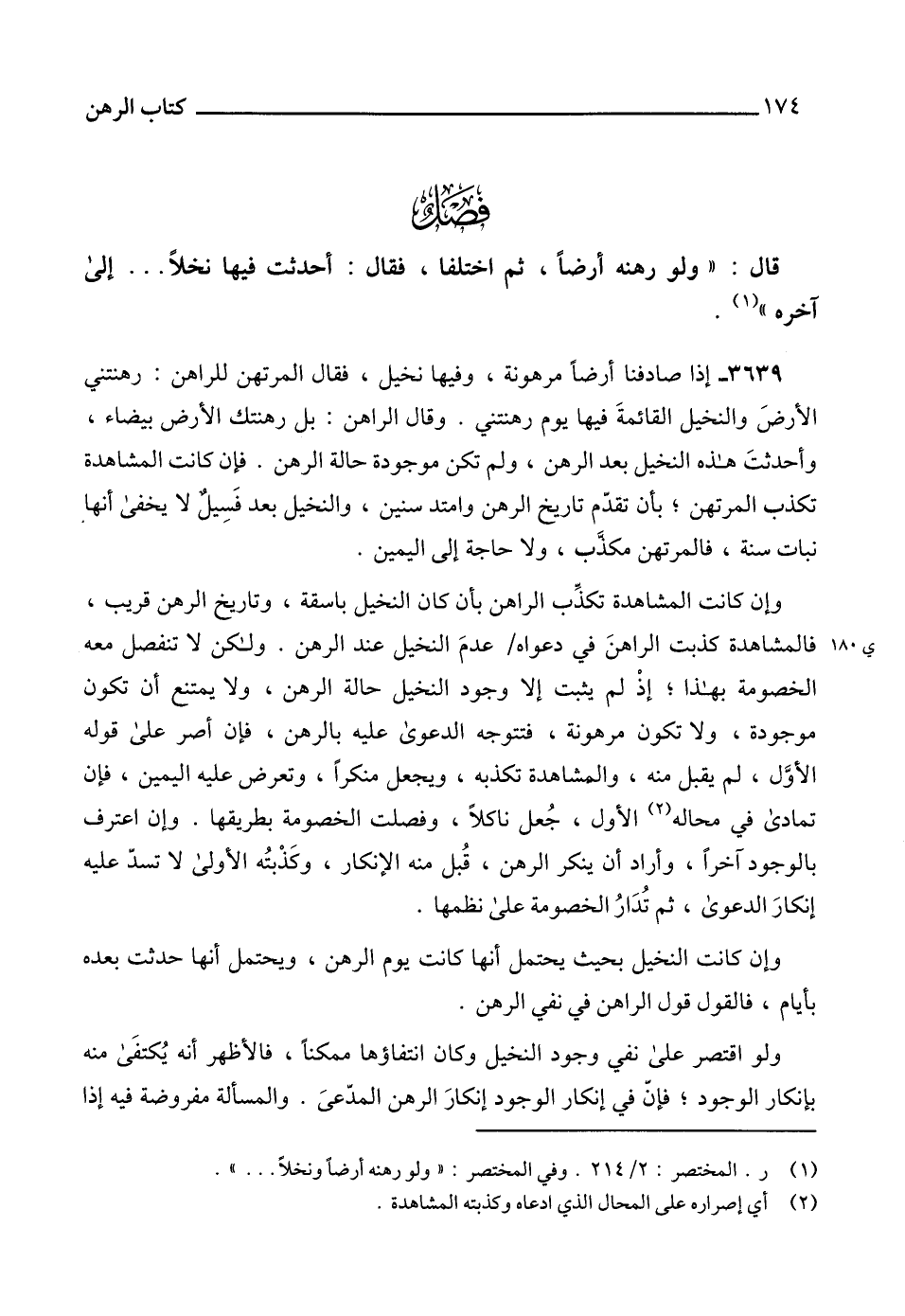3639 - إذا صادفنا أرضاً مرهونة، وفيها نخيل، فقالى المرتهن للراهن: رهنتني الأرضَ والنخيل القائمةَ فيها يوم رهنتني. وقال الراهن: بل رهنتك الأرض بيضاء، وأحدثتَ هذه النخيل بعد الرهن، ولم تكن موجودة حالة الرهن. فإن كانت المشاهدة تكذب المرتهن؛ بأن تقدّم تاريخ الرهن وامتد سنين، والنخيل بعد فَسِيلٌ لا يخفى أنها نبات سنة، فالمرتهن مكذَّب، ولا حاجة إلى اليمين.