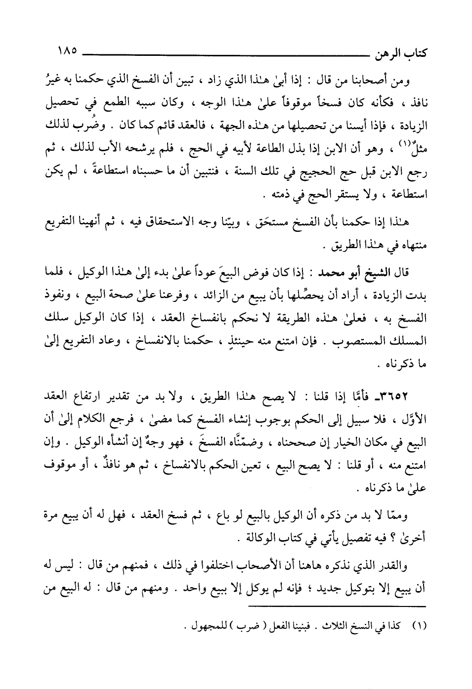 ومن أصحابنا من قال: إذا أبى هذا الذي زاد، تبين أن الفسخ الذي حكمنا به غيرُ نافذ، فكأنه كان فسخاً موقوفاً على هذا الوجه، وكان سببه الطمع في تحصيل الزيادة، فإذا أيسنا من تحصيلها من هذه الجهة، فالعقد قائم كما كان. وضُرب لذلك مثل (1)، وهو أن الابن إذا بذل الطاعة لأبيه في الحج، فلم يرشحه الأب لذلك، ثم رجع الابن قبل حج الحجيج في تلك السنة، فنتبين أن ما حسبناه استطاعةً، لم يكن استطاعة، ولا يستقر الحج في ذمته.