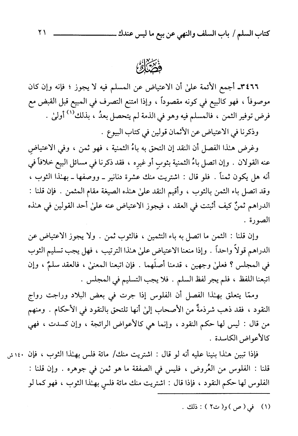وممّا يتعلق بهذا الفصل أن الفلوس إذا جرت في بعض البلاد وراجت رواج النقود، فقد ذهب شرذمةٌ من الأصحاب إلى أنها تلتحق بالنقود في الأحكام. ومنهم من قال: ليس لها حكم النقود، وإنما هي كالأعواض الرائجة، وإن كسدت، فهي كالأعواض الكاسدة.