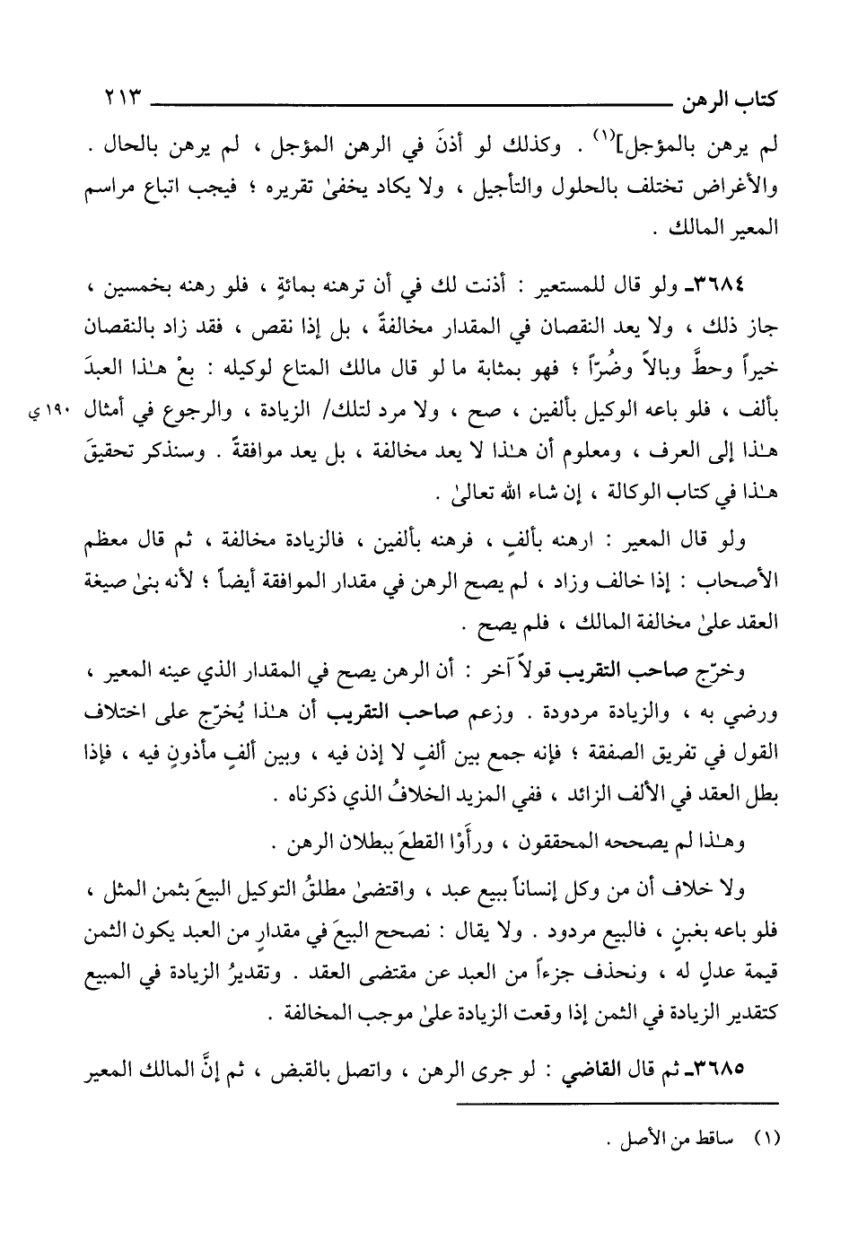 3684 - ولو قال للمستعير: أذنت لك في أن ترهنه بمائةٍ، فلو رهنه بخمسين، جاز ذلك، ولا يعد النقصان في المقدار مخالفةً، بل إذا نقص، فقد زاد بالنقصان خيراً وحطَّ وبالاً وضُرّاً؛ فهو بمثابة ما لو قال مالك المتاع لوكيله: بعْ هذا العبدَ بألف، فلو باعه الوكيل بألفين، صح، ولا مرد لتلك الزيادة، والرجوع في أمثال هذا إلى العرف، ومعلوم أن هذا لا يعد مخالفة، بل يعد موافقةً. وسنذكر تحقيقَ هذا في كتاب الوكالة، إن شاء الله تعالى.