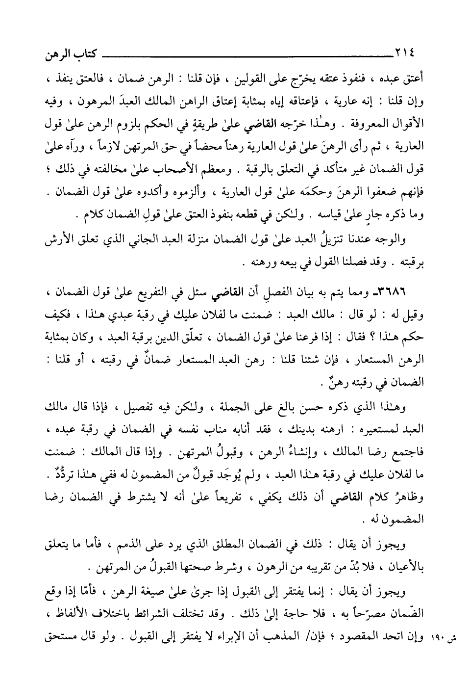 3686 - ومما يتم به بيان الفصلِ أن القاضي سئل في التفريع على قول الضمان، وقيل له: لو قال: مالك العبد: ضمنت ما لفلان عليك في رقبة عبدي هذا، فكيف حكم هذا؟ فقال: إذا فرعنا على قول الضمان، تعلّق الدين برقبة العبد، وكان بمثابة الرهن المستعار، فإن شئنا قلنا: رهن العبد المستعار ضمانٌ في رقبته، أو قلنا: الضمان في رقبته رهنٌ.