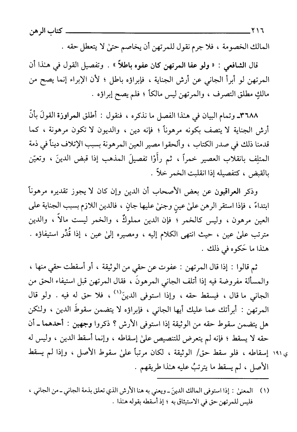 3688 - وتمام البيان في هذا الفصل ما نذكره، فنقول: أطلق المراوزة القولَ بأنّ أرش الجناية لا يتصف بكونه مرهوناً؛ فإنه دين، والديون لا تكون مرهونة، كما قدمنا ذلك في صدر الكتاب، وألحقوا مصير العين المرهونة بسبب الإتلاف ديناً في ذمة المتلِف بأنقلاب العصير خمراً، ثم رأَوْا تفصيلَ المذهب إذا قبض الدينَ، وتعيّن بالقبض، كتفصيله إذا انقلبت الخمر خلاً.