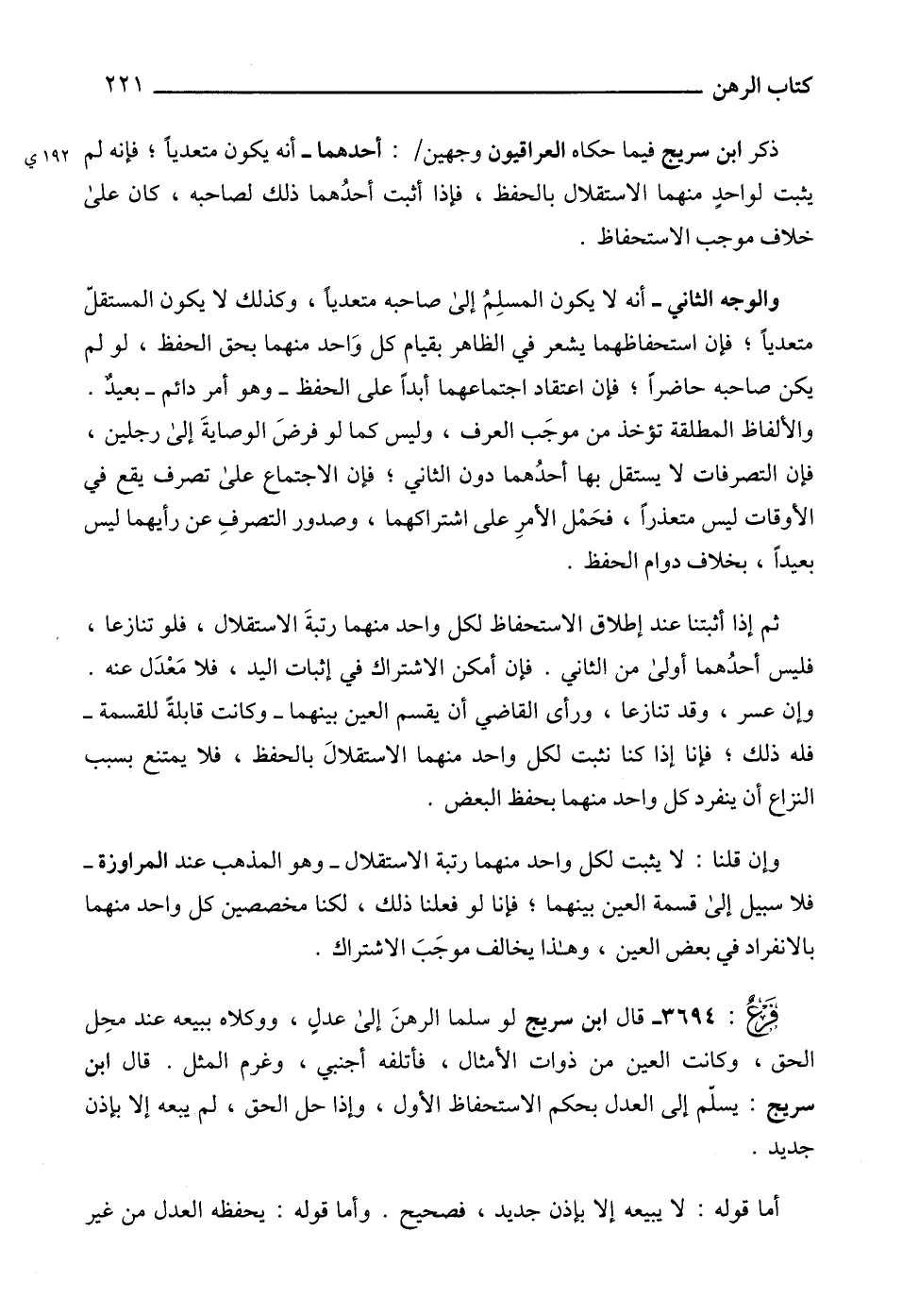 3694 - قال ابن سريج لو سلما الرهنَ إلى عدلٍ، ووكلاه ببيعه عند محِل الحق، وكانت العين من ذوات الأمثال، فأتلفه أجنبي، وغرم المثل. قال ابن سريج: يسلّم إلى العدل بحكم الاستحفاظ الأول، وإذا حل الحق، لم يبعه إلا بإذن جديد.