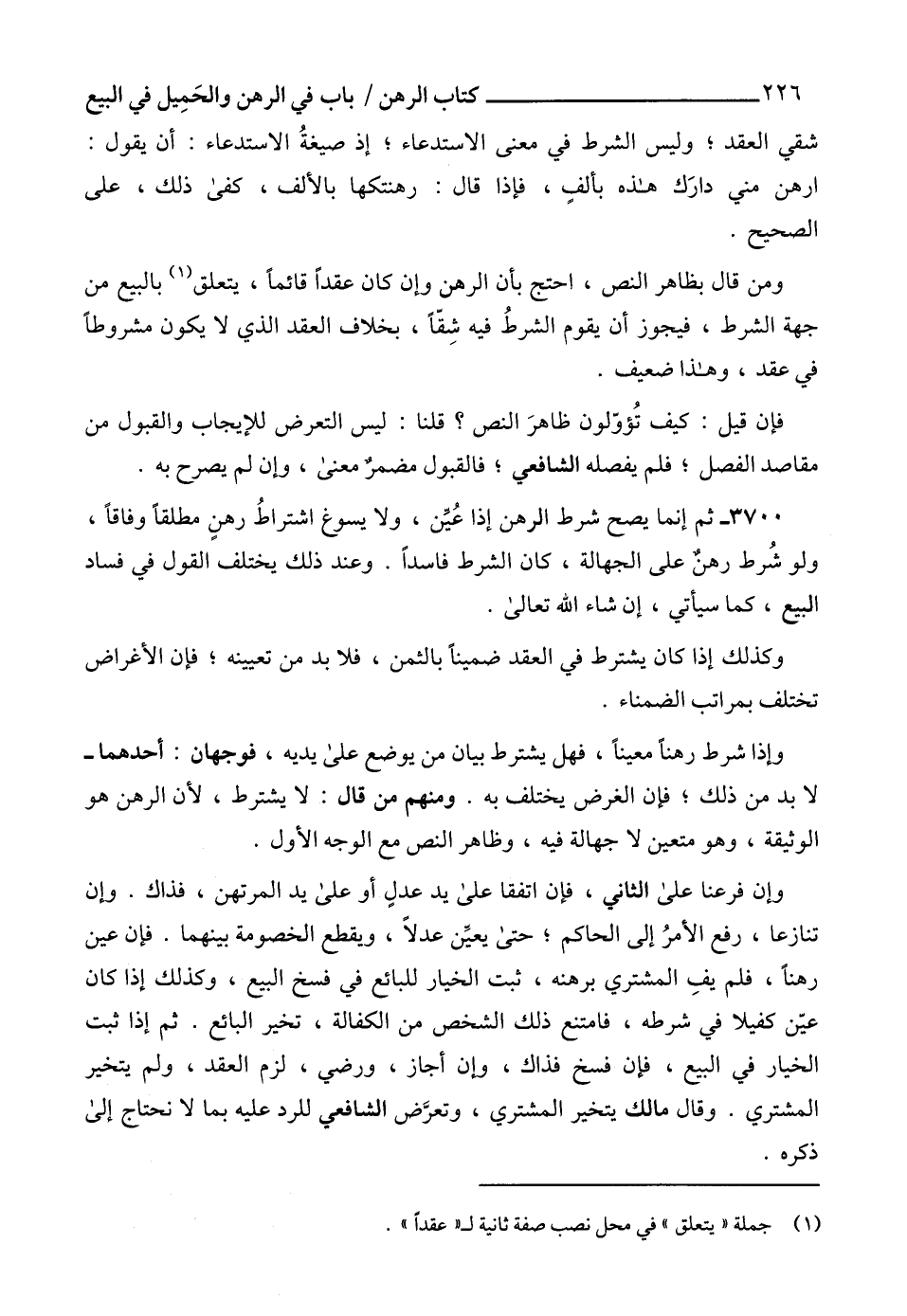 3700 - ثم إنما يصح شرط الرهن إذا عُيِّن، ولا يسوغ اشتراطُ رهنٍ مطلقاًً وفاقاً، ولو شُرط رهنٌ على الجهالة، كان الشرط فاسداً. وعند ذلك يختلف القول في فساد البيع، كما سيأتي، إن شاء الله تعالى.