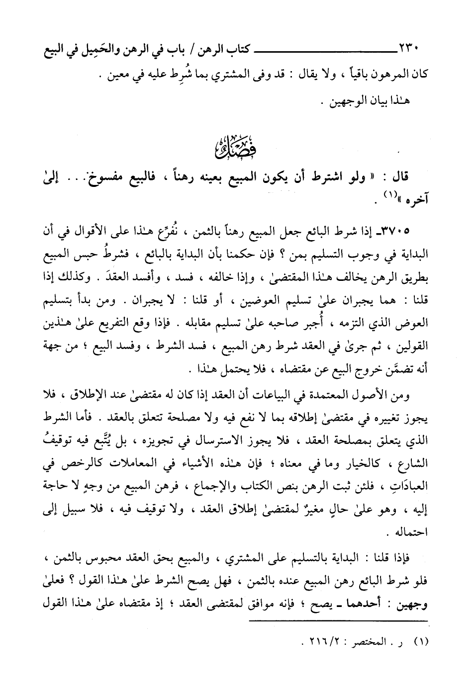 3705 - إذا شرط البائع جعل المبيع رهناً بالثمن، نُفرِّع هذا على الأقوال في أن البداية في وجوب التسليم بمن؟ فإن حكمنا بأن البداية بالبائع، فشرطُ حبس المبيع بطريق الرهن يخالف هذا المقتضى، وإذا خالفه، فسد، وأفسد العقدَ. وكذلك إذا قلنا: هما يجبران على تسليم العوضين، أو قلنا: لا يجبران. ومن بدأ بتسليم العوض الذي التزمه، أجبر صاحبه على تسليم مقابله. فإذا وقع التفريع على هذين القولين، ثم جرى في العقد شرط رهن المبيع، فسد الشرط، وفسد البيع، من جهة أنه تضمَّن خروج البيع عن مقتضاه، فلا يحتمل هذا.