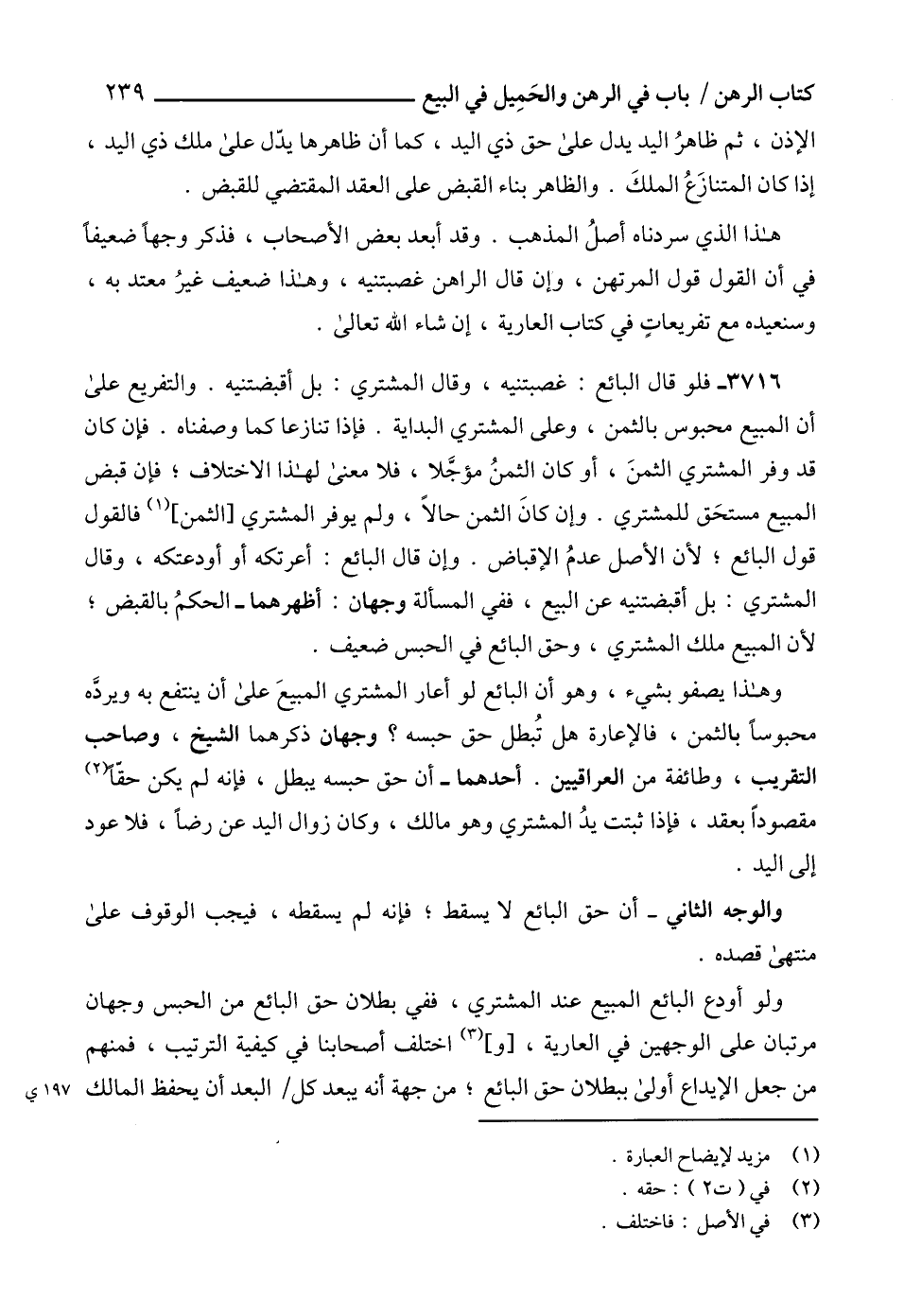 وهذا يصفو بشيء، وهو أن البائع لو أعار المشتري المبيعَ على أن ينتفع به ويردَّه محبوساً بالثمن، فالإعارة هل تُبطل حق حبسه؟ وجهان ذكرهما الشيخ، وصاحب التقريب، وطائفة من العراقيين. أحدهما - أن حق حبسه يبطل، فإنه لم يكن حقّاً (2) مقصوداَّ بَعقد، فإذا ثبتت يدُ المشتري وهو مالك، وكان زوال اليد عن رضاً، فلا عود إلى اليد.