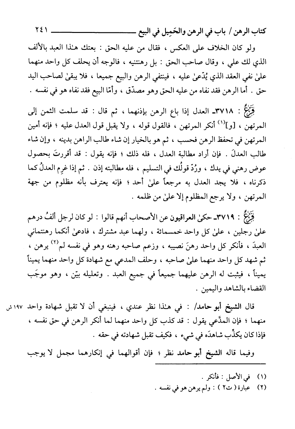 3719 - حكى العراقيون عن الأصحاب أنهم قالوا: لو كان لرجل ألفُ درهم على رجلين، على كل واحد خمسمائة، ولهما عبد مشترك، فادعى أنكما رهنتماني العبدَ، فأنكر كل واحد رهنَ نصيبه، وزعم صاحبه رهنه وهو في نفسه لم (2) يرهن، ثم شهد كل واحد منهما على صاحبه، وحلف المدعي مع شهادة كل واحد منهما يميناً يميناً، فيثبت له الرهن عليهما جميعاً في جميع العبد. وتعليله بيّن، وهو موجَب القضاء بالشاهد واليمين.
