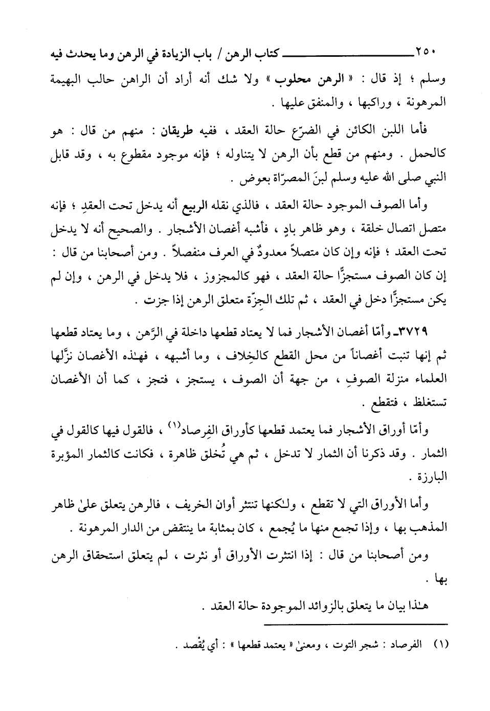 3729 - وأمّا أغصان الأشجار فما لا يعتاد قطعها داخلة في الرَّهن، وما يعتاد قطعها ثم إنها تنبت أغصاناً من محل القطع كالخِلاف، وما أشبهه، فهذه الأغصان نزَّلها العلماء منزلة الصوفِ، من جهة أن الصوف، يستجز، فتجز، كما أن الأغصان تستغلظ، فتقطع.