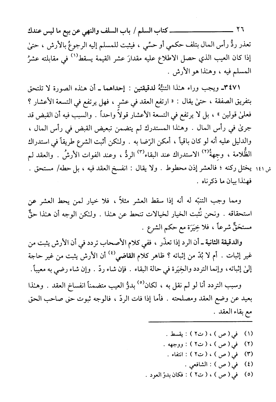 3471 - ويجب وراء هذا التنبّهُ لدقيقتين: إحداهما- أن هذه الصورة لا تلتحق بتفريق الصفقة، حتى يقال: " ارتفع العقد في عشرٍ، فهل يرتفع في التسعة الأعشار؟ فعلى قولين "، بل لا يرتفع في التسعة الأعشار قولاً واحداً. والسبب فيه أن القبض قد جرى في رأس المال. وهذا المستدرك لم يتضمن تبعيض القبض في رأس المال، والدليل عليه أنه لو كان باقياً، أمكن الرّضا به. ولكن أثبت الشرع طريقاً في استدراك الظُّلامة، وجِهةُ (2) الاستدراك عند البقاء (3) الرد، وعند الفوات الأرشُ. والعقد لم يختل ركنه؛ فالعشر إذن محطوط. ولا يقال: انفسخ العقد فيه، بل حطه مستحق.