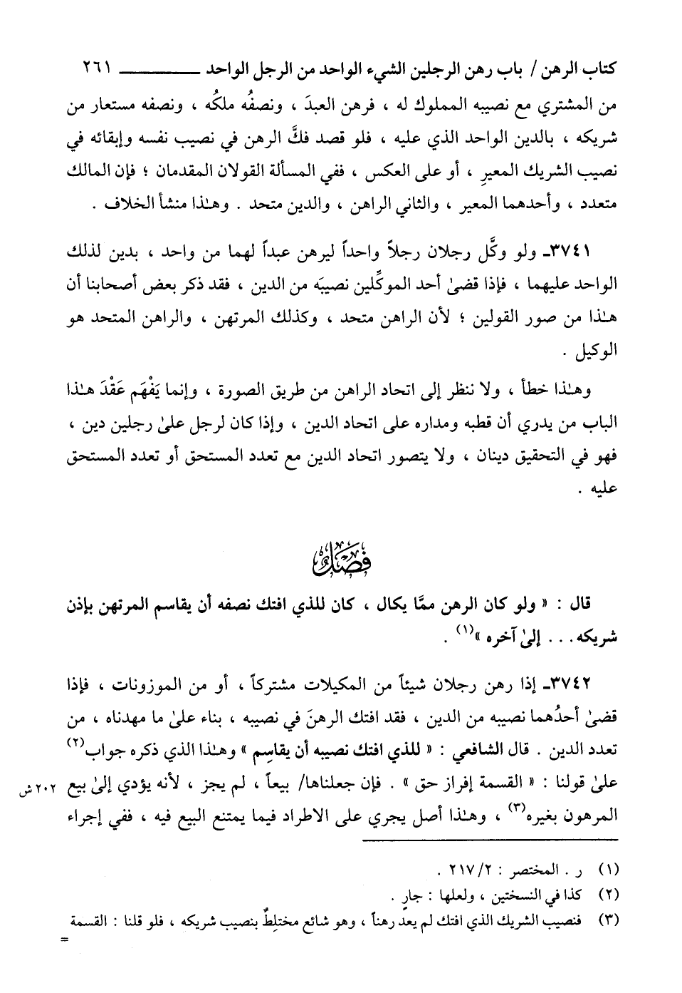 3741 - ولو وكَّل رجلان رجلاً واحداً ليرهن عبداً لهما من واحد، بدين لذلك الواحد عليهما، فإذا قضى أحد الموكِّلين نصيبَه من الدين، فقد ذكر بعض أصحابنا أن هذا من صور القولين؛ لأن الراهن متحد، وكذلك المرتهن، والراهن المتحد هو الوكيل.