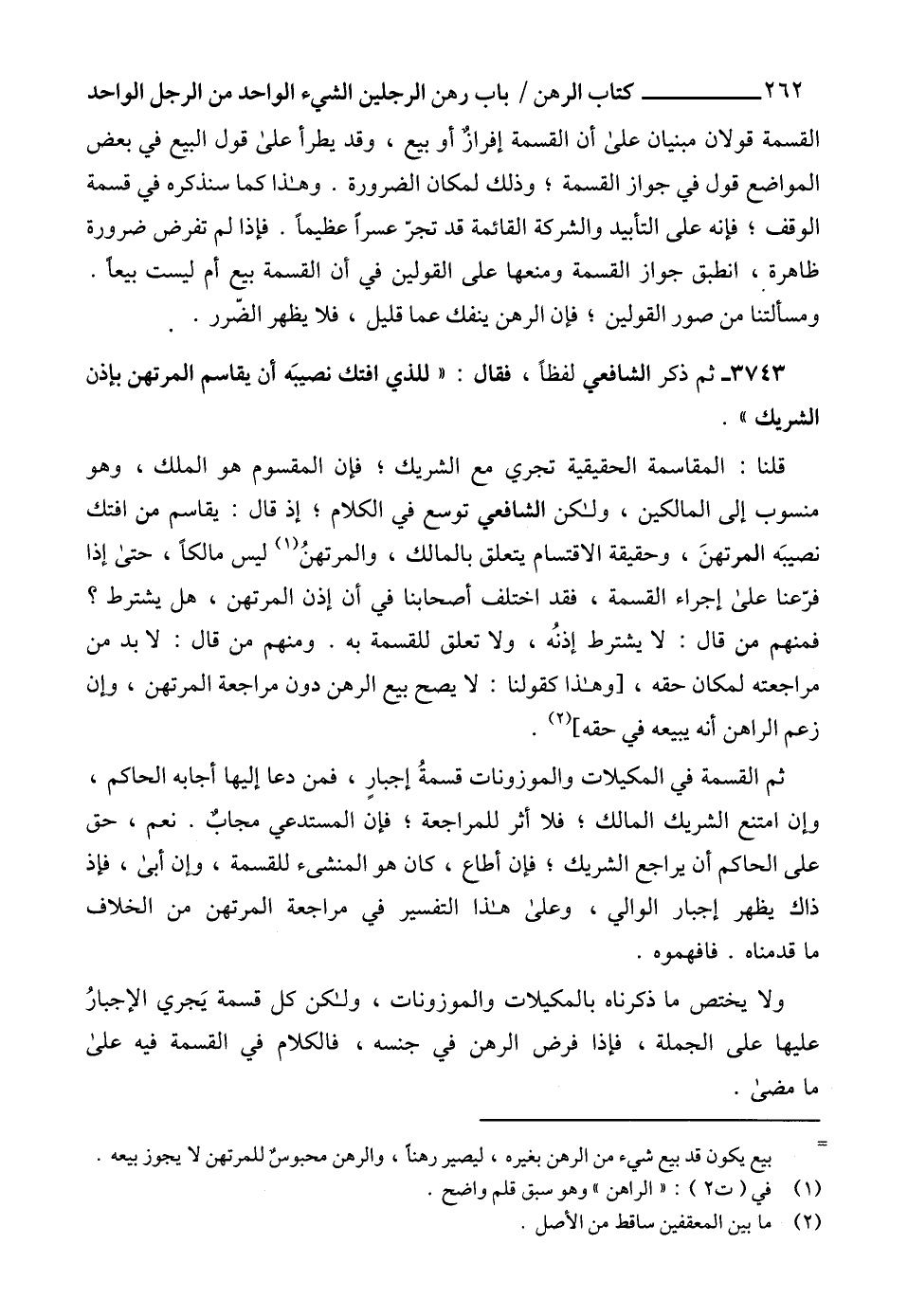 3743 - ثم ذكر الشافعي لفظاً، فقال: " للذي افتك نصيبَه أن يقاسم المرتهن بإذن