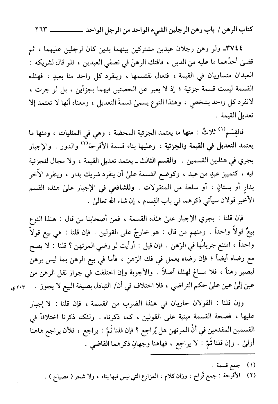 3744 - ولو رهن رجلان عبدين مشتركين بينهما بدين كان لرجلين عليهما، ثم قضى أحدُهما ما عليه من الدين، فافتك الرهنَ في نصفي العبدين، فلو قال لشريكه: العبدان متساويان في القيمة، فتعال نقتسمها، وينفرد كل واحد منا بعبدٍ، فهذه القسمة ليست قسمة جزئية؛ إذ لا يعبر عن الحصتين فيهما بجزأين، بل لو جرت، لانفرد كل واحد بشخصٍ، وهذا النوع يسمى قسمةَ التعديل، ومعناه أنها لا تعتمد إلا تعديلَ القيمة.