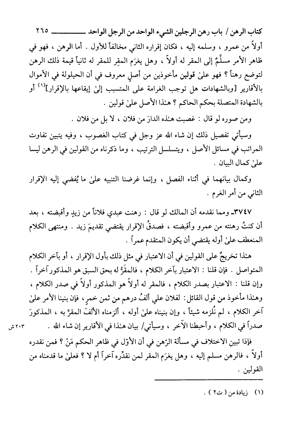 3747 - ومما نقدمه أن المالك لو قال: رهنت عبدي فلاناً من زيدٍ وأقبضته، بعد أن كنتُ رهنته من عمرو وأقبضته، فصدقُ الإقرار يقتضي تقديمَ زيد. ومنتهى الكلام المنعطف على أوله يقتضي أن يكون المتقدم عمراً.