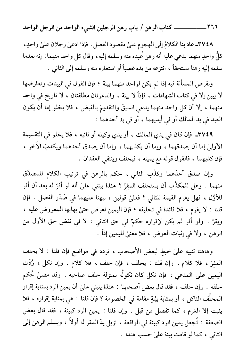 3748 - عاد بنا الكلامُ إلى الهجوم على مقصود الفصل. فإذا ادعى رجلان على واحدٍ، كلُّ واحدِ منهما يدعي عليه أنه رهن عبده منه وسلمه إليه، وقال كل واحد منهما: إنه بعدما سلمه إليه رهناً مستحقاً، انتزعه من يده غصباً أو استعاره منه وسلمه إلى الثاني.