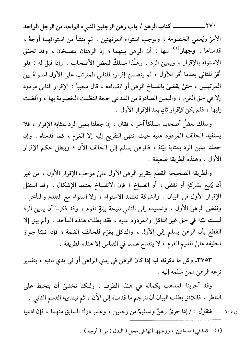 والطريقة الصحيحة القطع بتقرير الرهن الأول على موجب الإقرار الأول، من غير أن يُتبع بشركةٍ أو نقض، أو انفساخ؛ فإن الانفساخ يعتمد الإشكال، وقد استقل الإقرار الأول في البيان. والشركة تعتمد الاستواء، ولا استواء مع التقدم والتأخر.