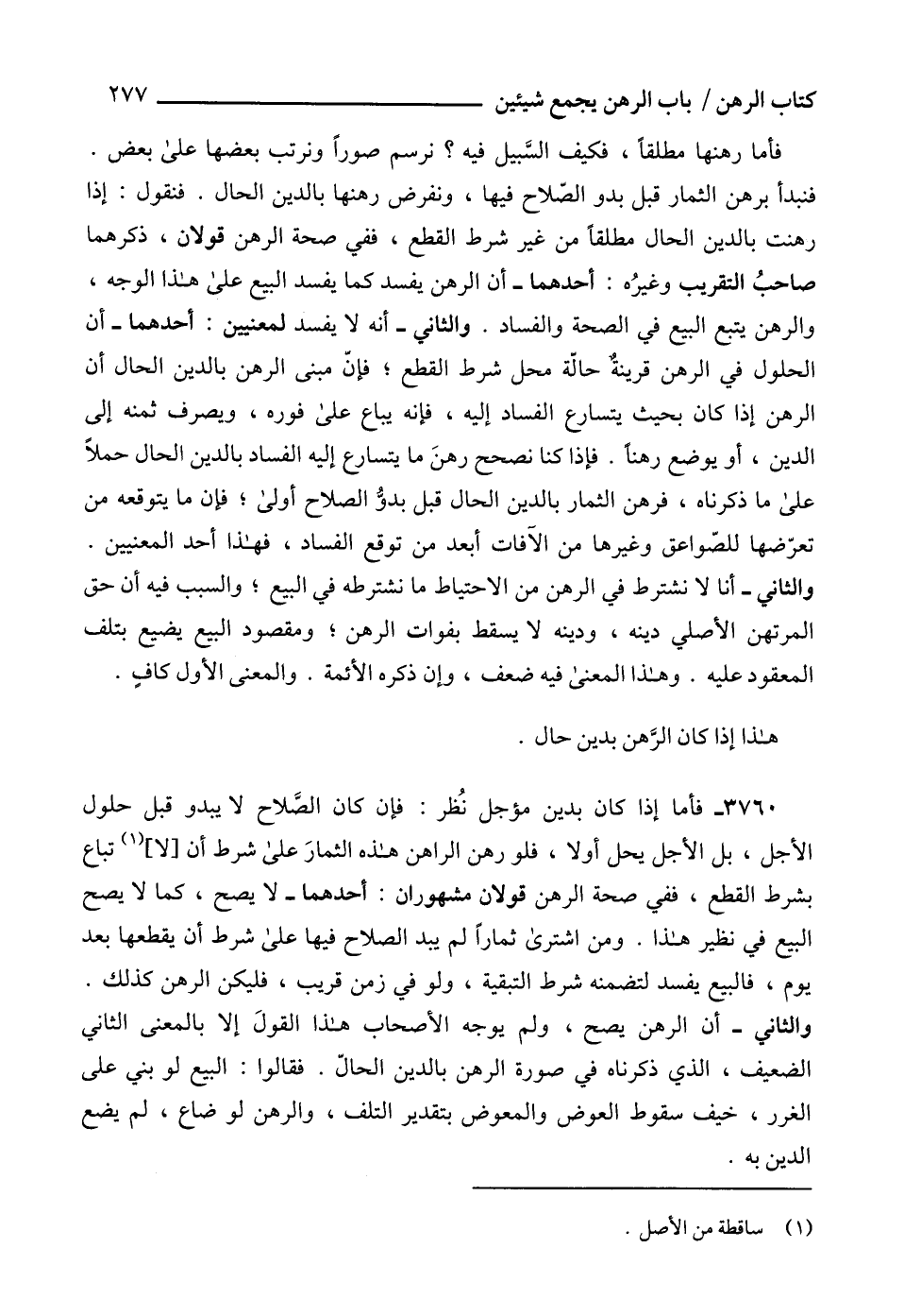 3760 - فأما إذا كان بدين مؤجل نُظر: فإن كان الصَّلاح لا يبدو قبل حلول الأجل، بل الأجل يحل أولا، فلو رهن الراهن هذه الثمارَ على شرط أن [لا] (1) تباع بشرط القطع، ففي صحة الرهن قولان مشهوران: أحدهما - لا يصح، كما لا يصح البيع في نظير هذا. ومن اشترى ثماراً لم يبد الصلاح فيها على شرط أن يقطعها بعد يوم، فالبيع يفسد لتضمنه شرط التبقية، ولو في زمن قريب، فليكن الرهن كذلك.