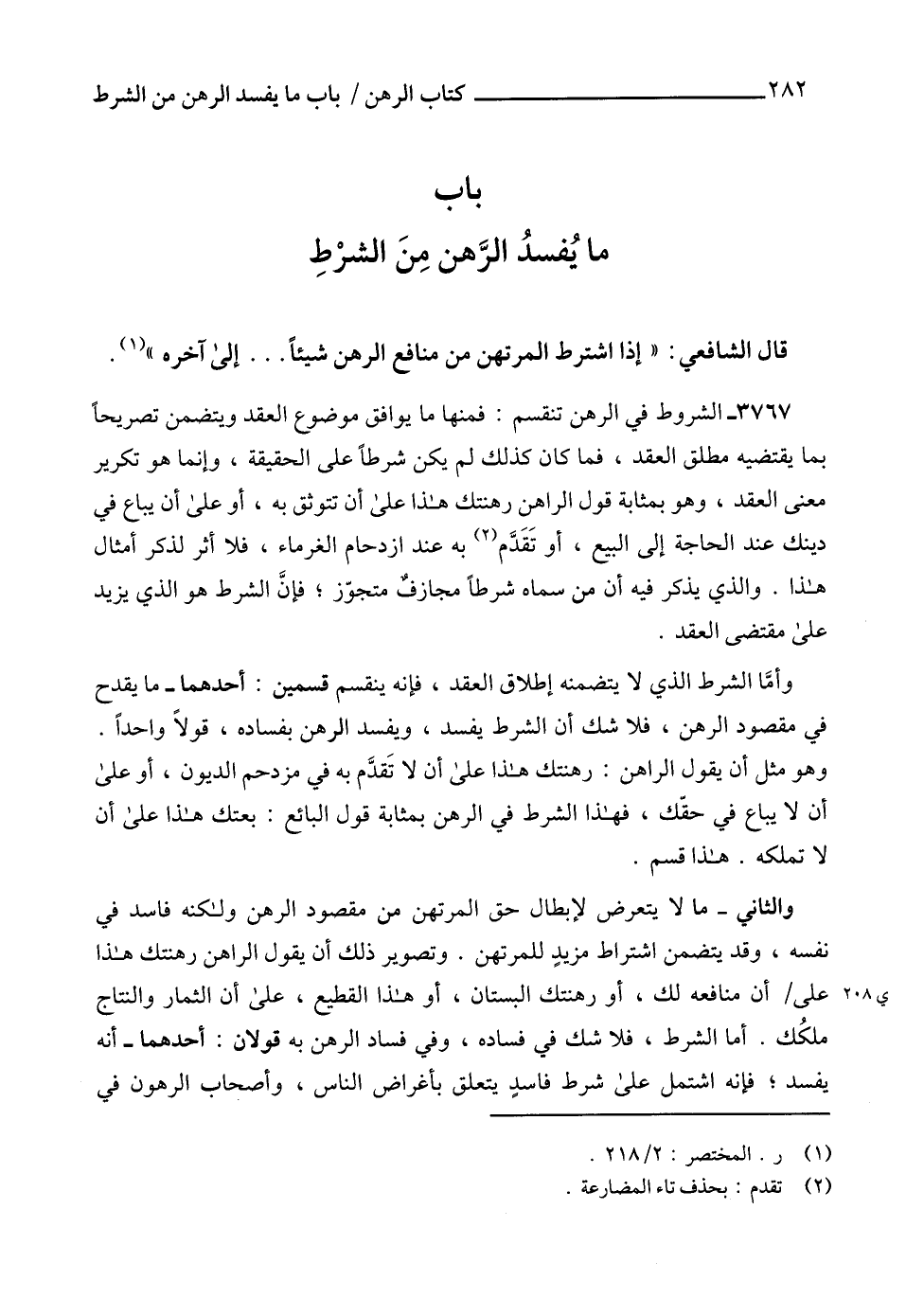 3767 - الشروط في الرهن تنقسم: فمنها ما يوافق موضوع العقد ويتضمن تصريحاً بما يقتضيه مطلق العقد، فما كان كذلك لم يكن شرطاً على الحقيقة، وإنما هو تكرير معنى العقد، وهو بمثابة قول الراهن رهنتك هذا على أن تتوثق به، أو على أن يباع في دينك عند الحاجة إلى البيع، أو تَقَدَّم (2) به عند ازدحام الغرماء، فلا أثر لذكر أمثال هذا. والذي يذكر فيه أن من سماه شرطاً مجازفٌ متجوّز؛ فإنَّ الشرط هو الذي يزيد على مقتضى العقد.
