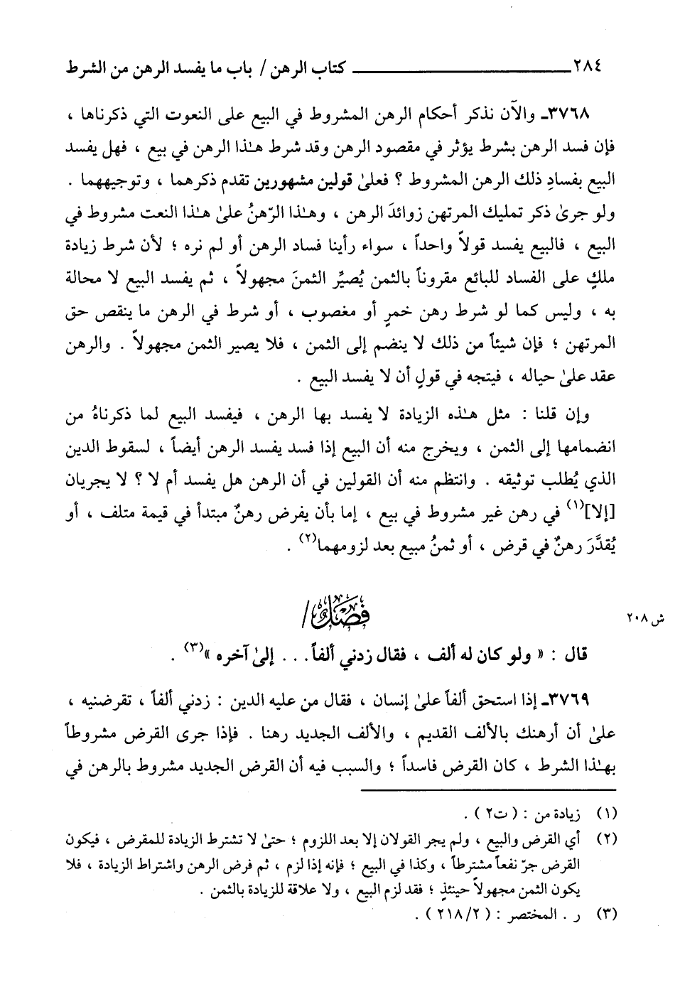 3769 - إذا استحق ألفاً على إنسان، فقال من عليه الدين: زدني ألفاً، تقرضنيه، على أن أرهنك بالألف القديم، والألف الجديد رهنا. فإذا جرى القرض مشروطاًً بهذا الشرط، كان القرض فاسداً؛ والسبب فيه أن القرض الجديد مشروط بالرهن في