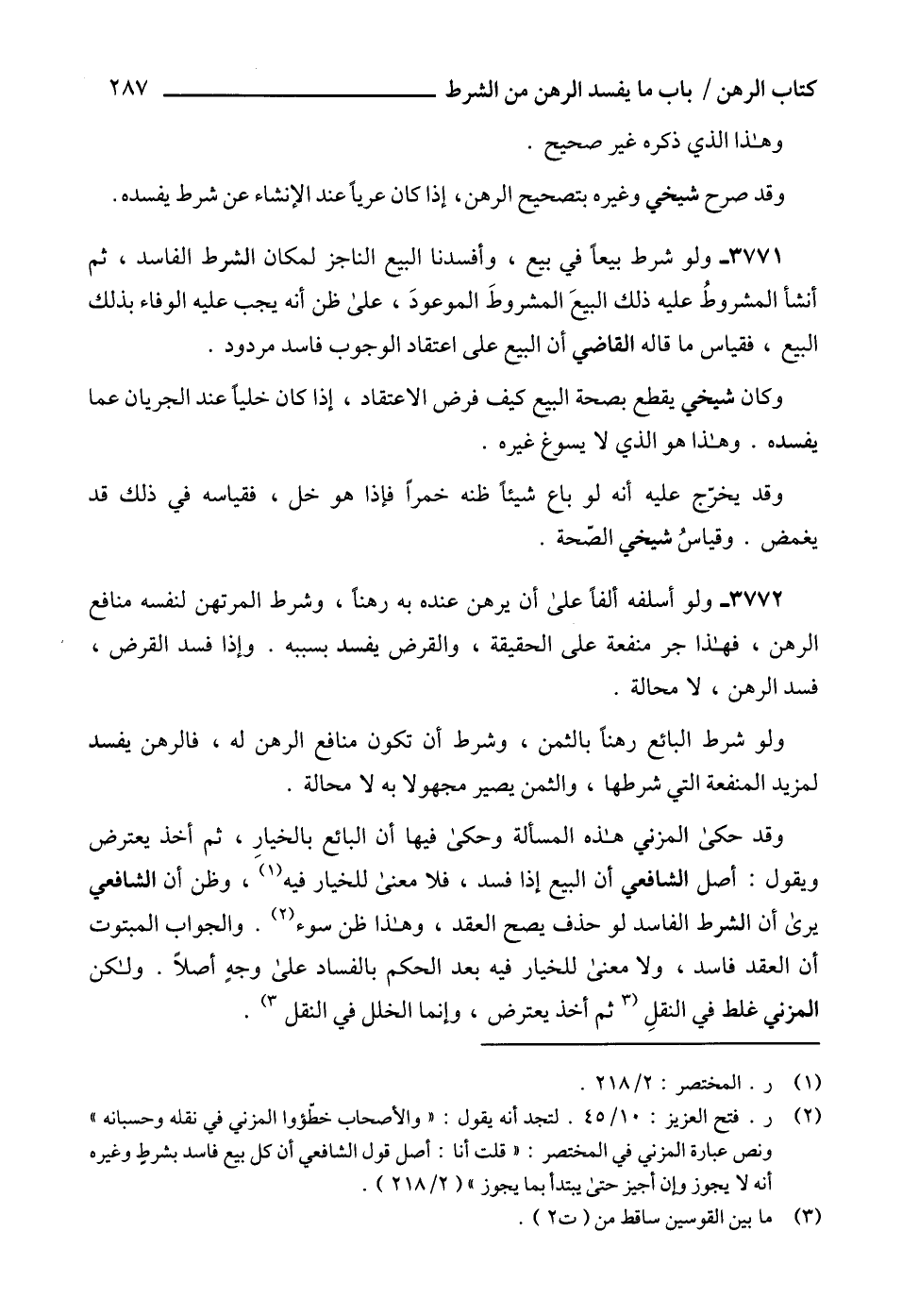 (2) ر. فتح العزيز: 10/ 45. لتجد أنه يقول: " والأصحاب خطّؤوا المزني في نقله وحسبانه " ونص عبارة المزني في المختصر: "قلت أنا: أصل قول الشافعي أن كل بيع فاسد بشرطٍ وغيره أنه لا يجوز وإن أجيز حتى يبتدأ بما يجوز" (2/ 218).
