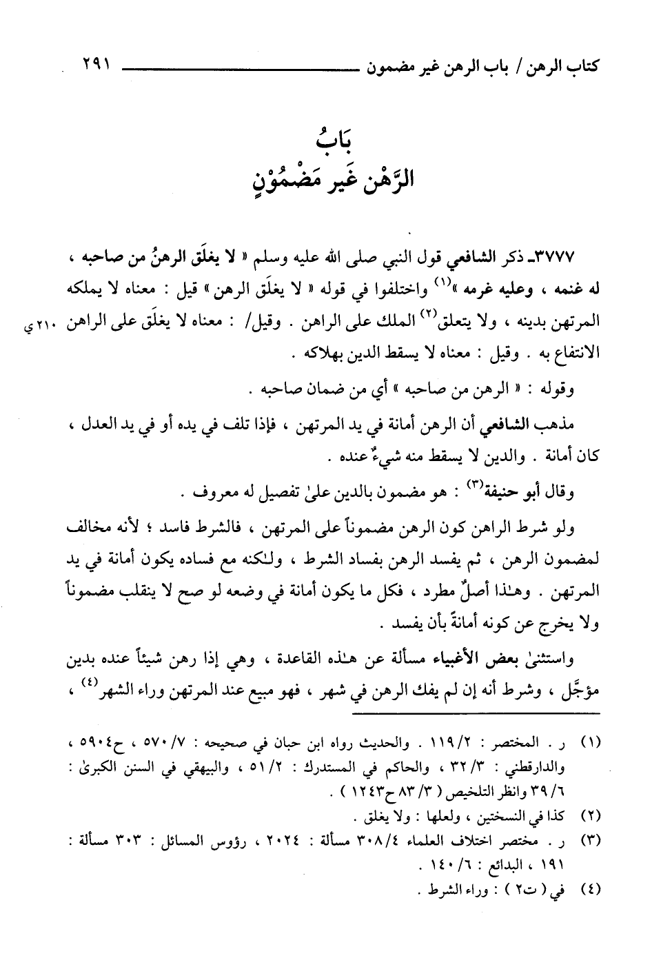 3777 - ذكر الشافعي قول النبي صلى الله عليه وسلم "لا يغلَق الرهنُ من صاحبه، له غنمه، وعليه غرمه " (1) واختلفوا في قوله " لا يغلَق الرهن " قيل: معناه لا يملكه المرتهن بدينه، ولا يتعلق (2) الملك على الراهن. وقيل: معناه لا يغلَق على الراهن الانتفاع به. وقيل: معناه لا يسقط الدين بهلاكه.