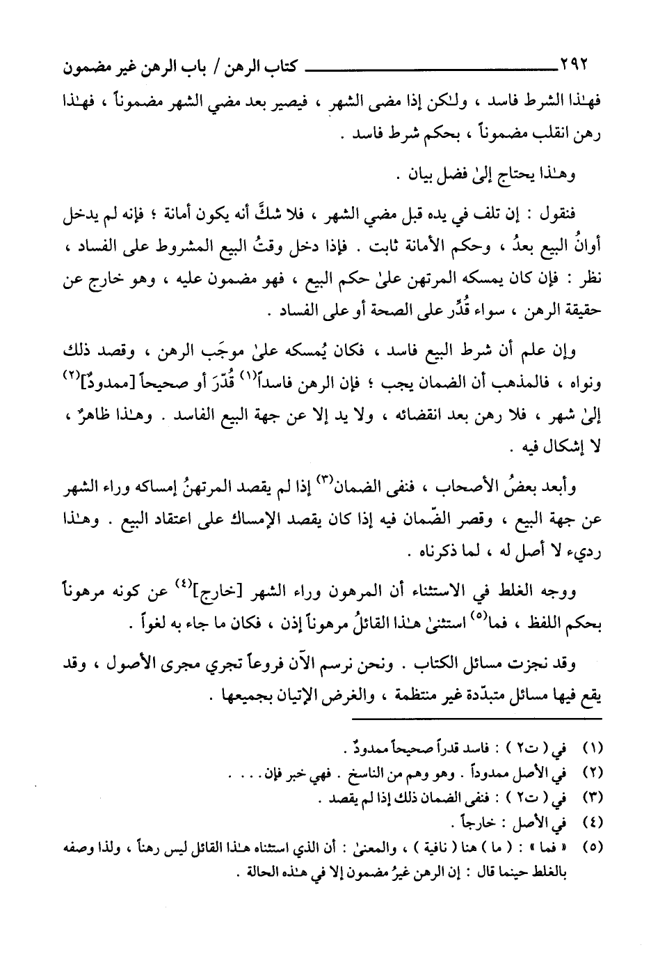 (5) " فما ": (ما) هنا (نافية)، والمعنى: أن الذي استثناه هذا القائل لي رهناً، ولذا وصفه بالغلط حينما قال: إن الرهن غيرُ مضمون إلا في هذه الحالة.