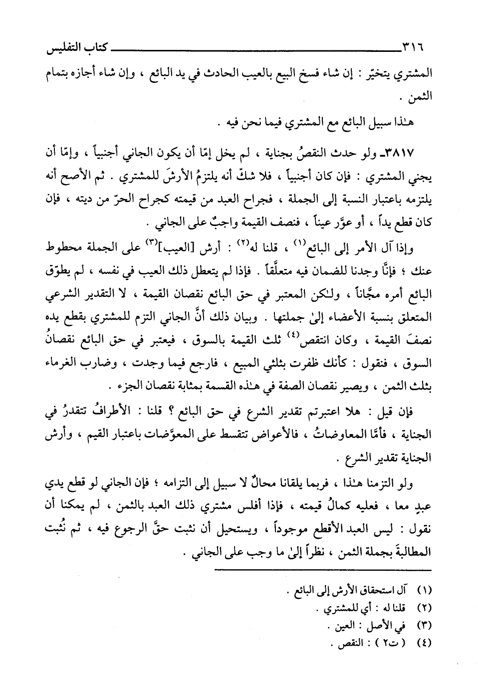 3817 - ولو حدث النقصُ بجناية، لم يخل إمّا أن يكون الجاني أجنبياً، وإمّا أن يجني المشتري: فإن كان أجنبياً، فلا شكّ أنه يلتزمُ الأرشَ للمشتري. ثم الأصح أنه يلتزمه باعتبار النسبة إلى الجملة، فجراح العبد من قيمته كجراح الحرّ من ديته، فإن كان قطع يداً، أو عوَّر عيناً، فنصف القيمة واجبٌ على الجاني.