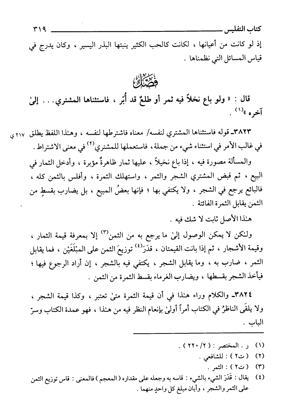 3823 - قوله فاستثناها المشتري لنفسه معناه فاشترطها لنفسه، وهذا اللفظ يطلق في غالب الأمر في استثناء شيء من جملة، فاستعملها للمشتري (2) في معنى الاشتراط.