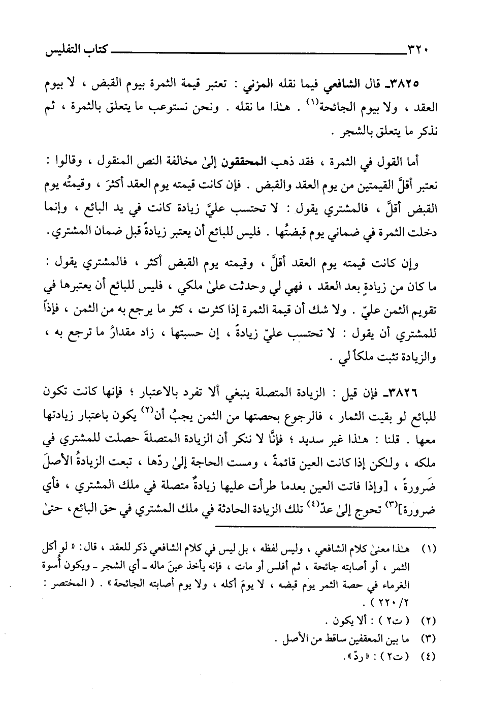 (1) هذا معنى كلام الشافعي، وليس لفظه، بل ليس في كلام الشافعي ذكر للعقد، قال: " لو أكل الثمر، أو أصابته جائحة، ثم أفلس أو مات، فإنه يأخذ عينَ ماله -أي الشجر- ويكون أُسوة الغرماء في حصة الثمر يوم قبضه، لا يومَ أكله، ولا يوم أصابته الجائحة". (المختصر: 2/ 220).