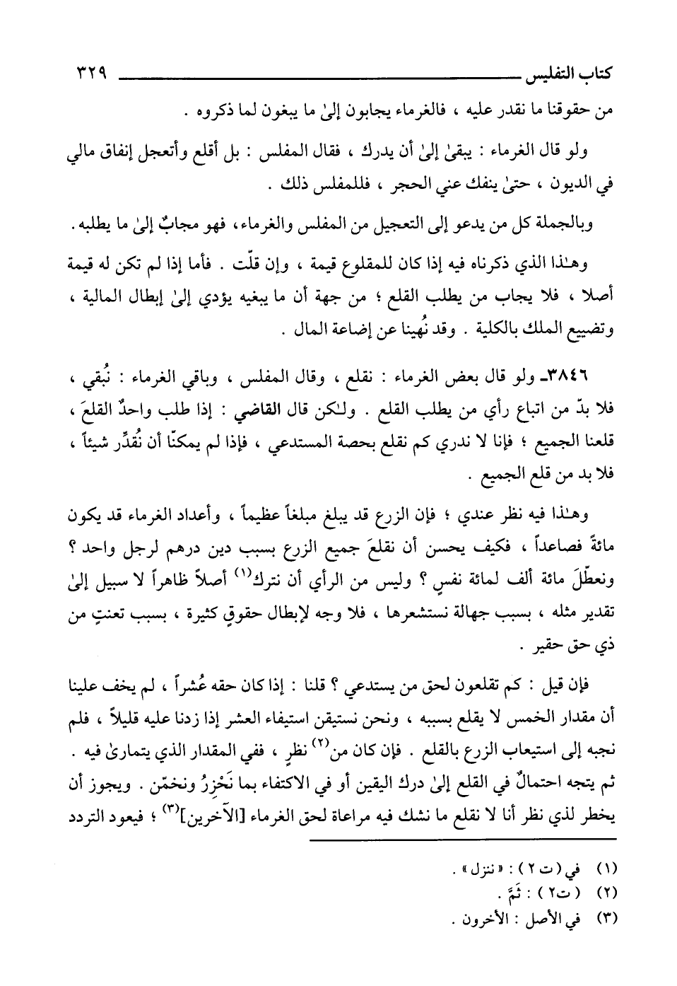 3846 - ولو قال بعض الغرماء: نقلع، وقال المفلس، وباقي الغرماء: نبُقي، فلا بدّ من اتباع رأي من يطلب القلع. ولكن قال القاضي: إذا طلب واحدٌ القلعَ، قلعنا الجميع، فإنا لا ندري كم نقلع بحصة المستدعي، فإذا لم يمكنّا أن نُقدِّر شيئاًً، فلا بد من قلع الجميع.