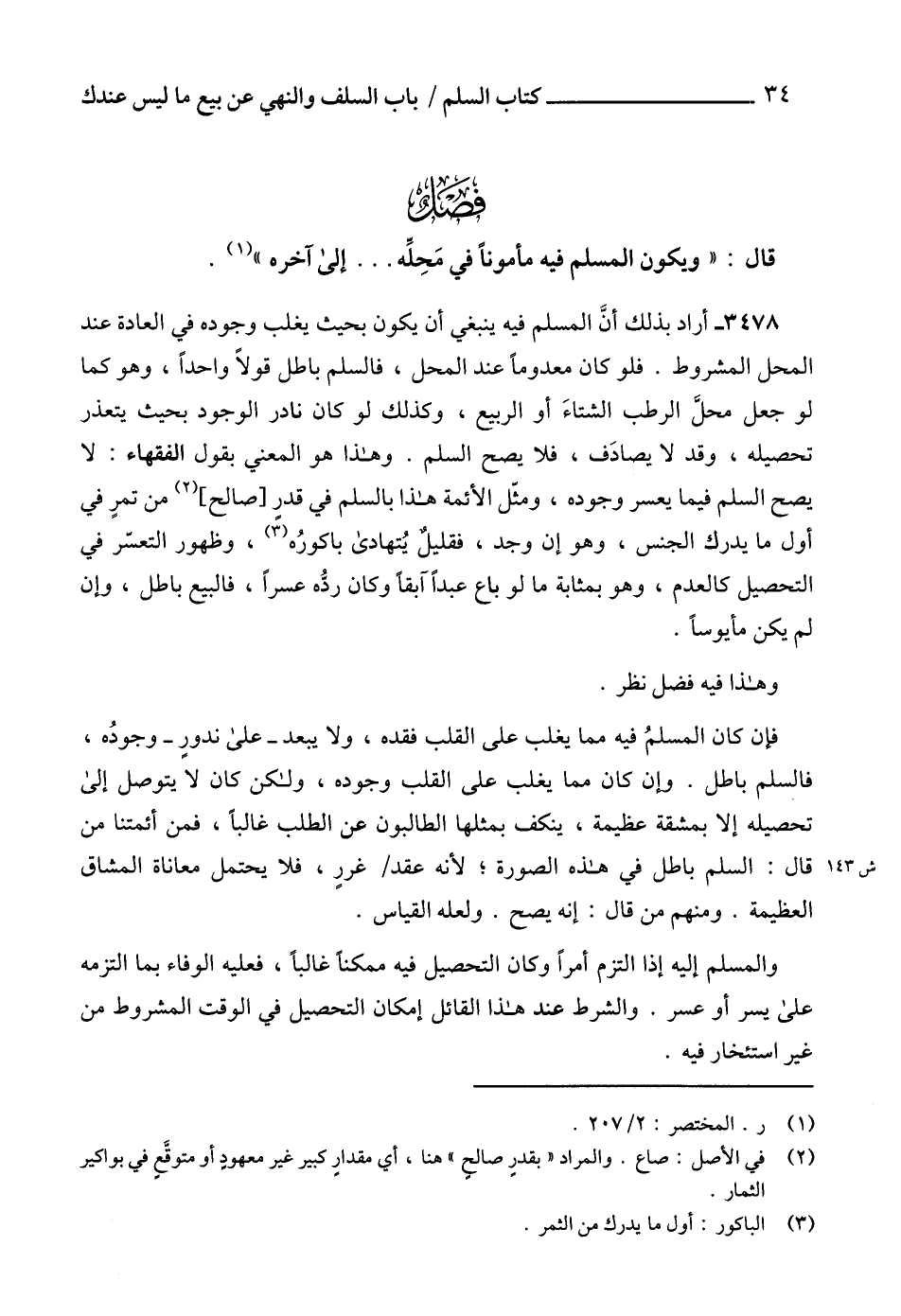 3478 - أراد بذلك أنَّ المسلم فيه ينبغي أن يكون بحيث يغلب وجوده في العادة عند المحل المشروط. فلو كان معدوماً عند المحل، فالسلم باطل قولاً واحداً، وهو كما لو جعل محلَّ الرطب الشتاءَ أو الربيع، وكذلك لو كان نادر الوجود بحيث يتعذر تحصيله، وقد لا يصادَف، فلا يصح السلم. وهذا هو المعني بقول الفقهاء: لا يصح السلم فيما يعسر وجوده، ومثّل الأئمة هذا بالسلم في قدرٍ [صالح] (2) من تمرٍ في أول ما يدرك الجنس، وهو إن وجد، فقليلٌ يُتهادى باكورُه (3)، وظهور التعسّر في التحصيل كالعدم، وهو بمثابة ما لو باع عبداً آبقاً وكان ردُّه عسراً، فالبيع باطل، وإن لم يكن مأيوساً.