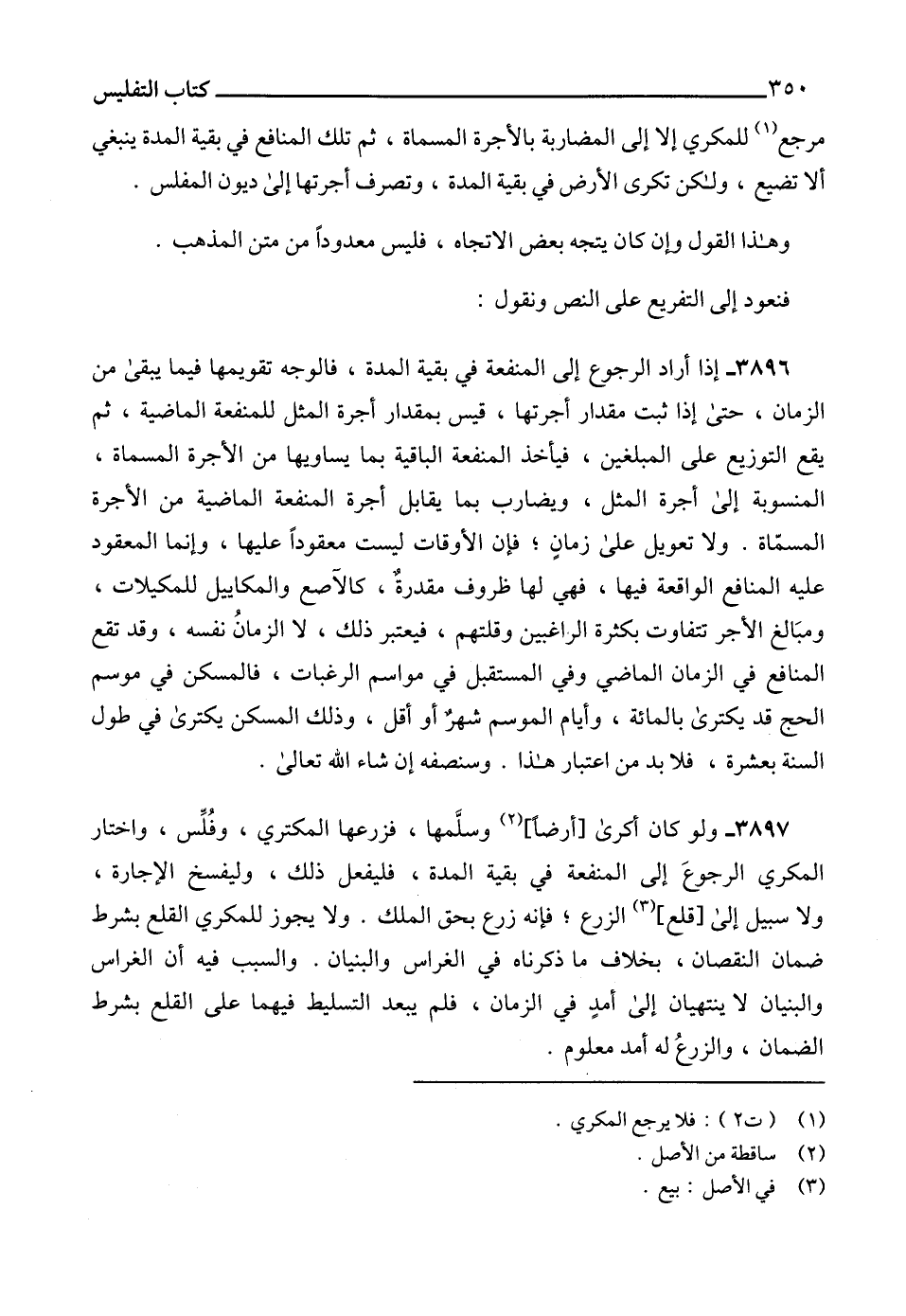 3896 - إذا أراد الرجوع إلى المنفعة في بقية المدة، فالوجه تقويمها فيما يبقى من الزمان، حتى إذا ثبت مقدار أجرتها، قيس بمقدار أجرة المثل للمنفعة الماضية، ثم يقع التوزيع على المبلغين، فيأخذ المنفعة الباقية بما يساويها من الأجرة المسماة، المنسوبة إلى أجرة المثل، ويضارب بما يقابل أجرة المنفعة الماضية من الأجرة المسمّاة. ولا تعويل على زمانٍ؛ فإن الأوقات ليست معقوداً عليها، وإنما المعقود عليه المنافع الواقعة فيها، فهي لها ظروف مقدرةٌ، كالآصع والمكاييل للمكيلات، ومبَالغ الأجر تتفاوت بكثرة الراغبين وقلتهم، فيعتبر ذلك، لا الزمانُ نفسه، وقد تقع المنافع في الزمان الماضي وفي المستقبل في مواسم الرغبات، فالمسكن في موسم الحج قد يكترى بالمائة، وأيام الموسم شهرٌ أو أقل، وذلك المسكن يكترى في طول السنة بعشرة، فلا بد من اعتبار هذا. وسنصفه إن شاء الله تعالى.