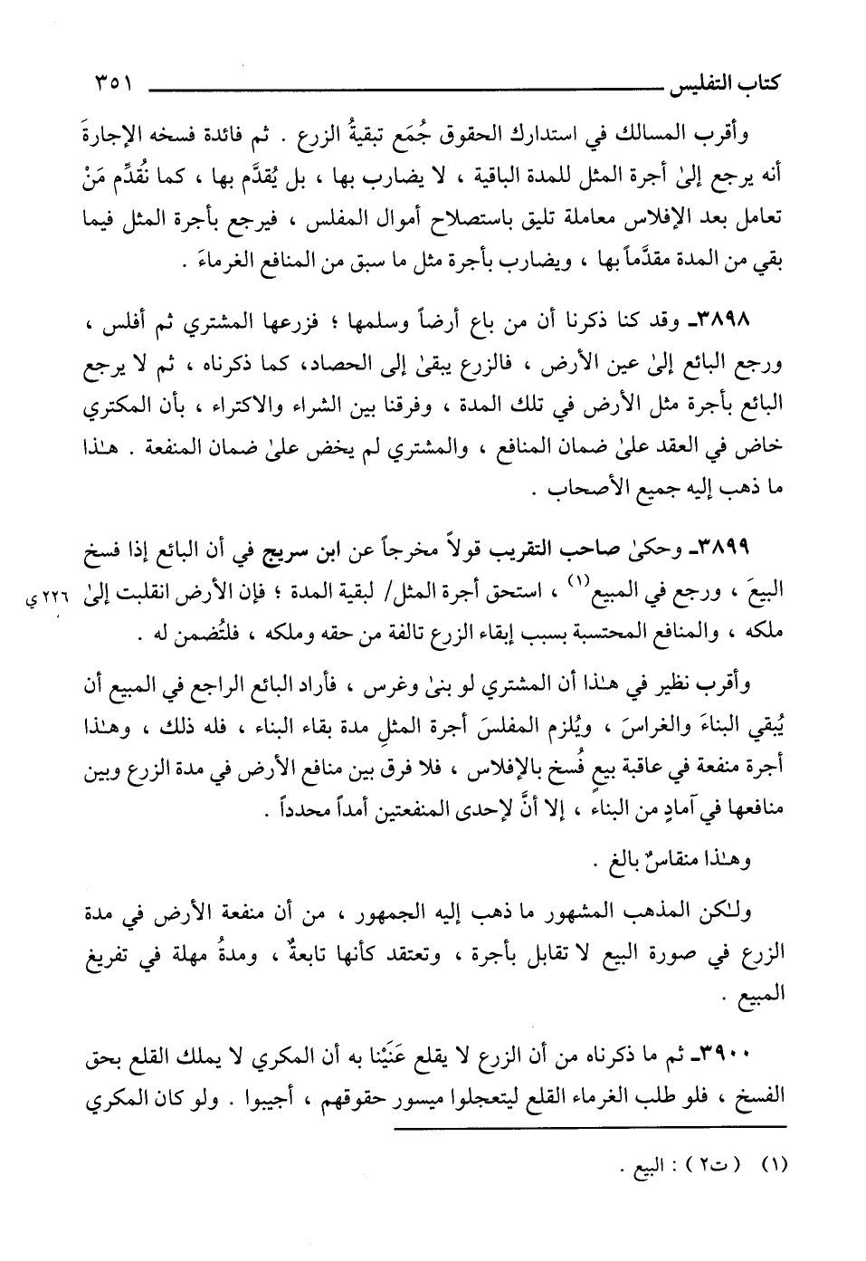 3898 - وقد كنا ذكرنا أن من باع أرضاً وسلمها؛ فزرعها المشتري ثم أفلس، ورجع البائع إلى عين الأرض، فالزرع يبقى إلى الحصاد، كما ذكرناه، ثم لا يرجع البائع بأجرة مثل الأرض في تلك المدة، وفرقنا بين الشراء والاكتراء، بأن المكتري خاض في العقد على ضمان المنافع، والمشتري لم يخض على ضمان المنفعة. هذا ما ذهب إليه جميع الأصحاب.