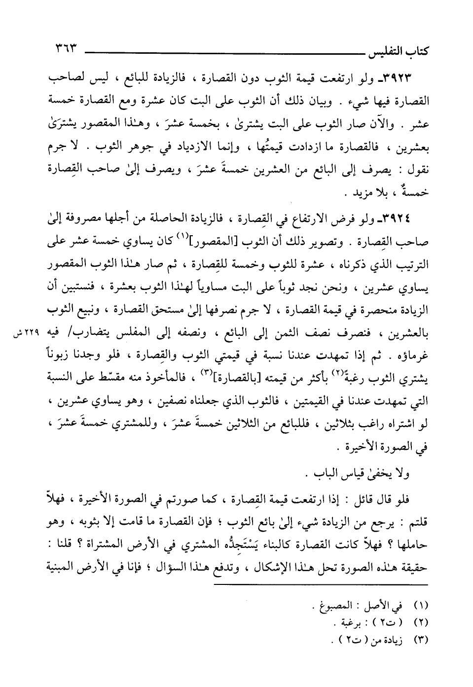 3923 - ولو ارتفعت قيمة الثوب دون القصارة، فالزيادة للبائع، ليس لصاحب القصارة فيها شيء. وبيان ذلك أن الثوب على البت كان عشرة ومع القصارة خمسة عشر. والآن صار الثوب على البت يشترى، بخمسة عشرَ، وهذا المقصور يشترَى بعشرين، فالقصارة ما ازدادت قيمتُها، وإنما الازدياد في جوهر الثوب. لا جرم نقول: يصرف إلى البائع من العشرين خمسةَ عشرَ، ويصرف إلى صاحب القِصارة خمسةٌ، بلا مزيد.