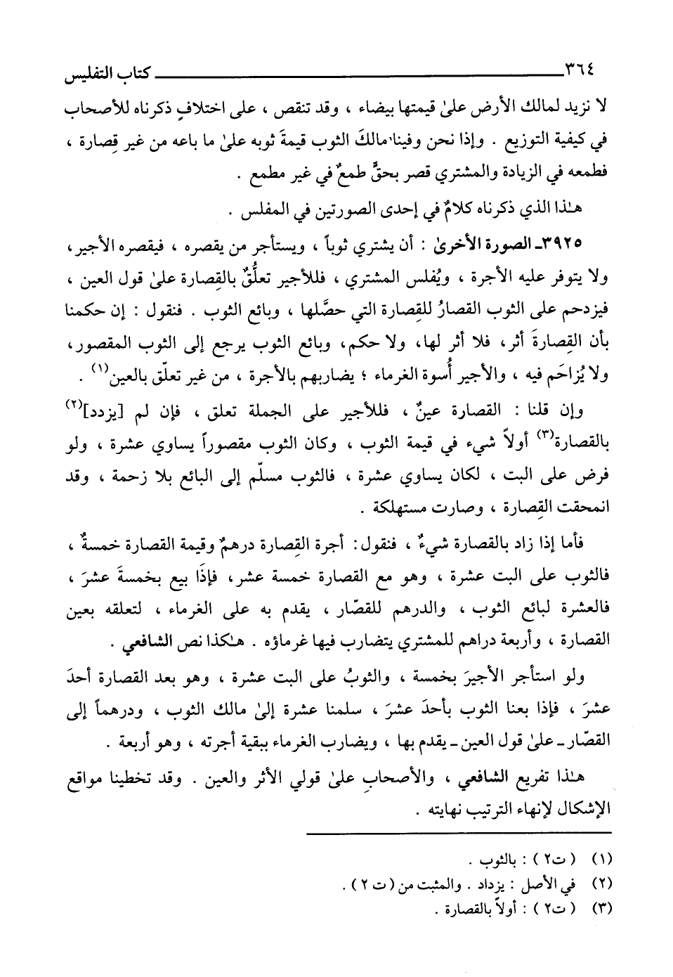 3925 - الصورة الأخرى: أن يشتري ثوباًً، ويستأجر من يقصره، فيقصره الأجير، ولا يتوفر عليه الأجرة، ويُفلس المشتري، فللأجير تعلُّقٌ بالقِصارة على قول العين، فيزدحم على الثوب القصارُ للقِصارة التي حصَّلها، وبائع الثوب. فنقول: إن حكمنا بأن القِصارةَ أثر، فلا أثر لها، ولا حكم، وبائع الثوب يرجع إلى الثوب المقصور، ولا يُزاحَم فيه، والأجير أُسوة الغرماء؛ يضاربهم بالأجرة، من غير تعلّق بالعين (1).